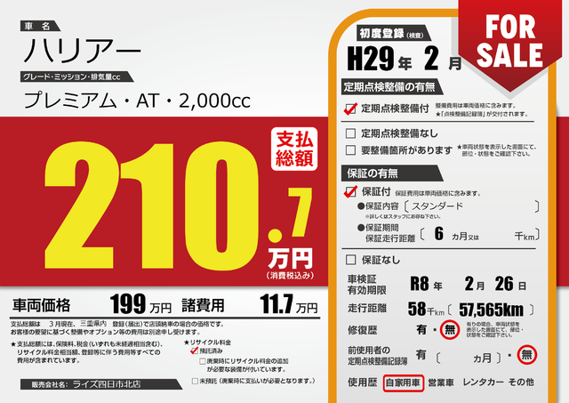 | 定期点検整備 | 定期点検整備あり 納車時あり | ||