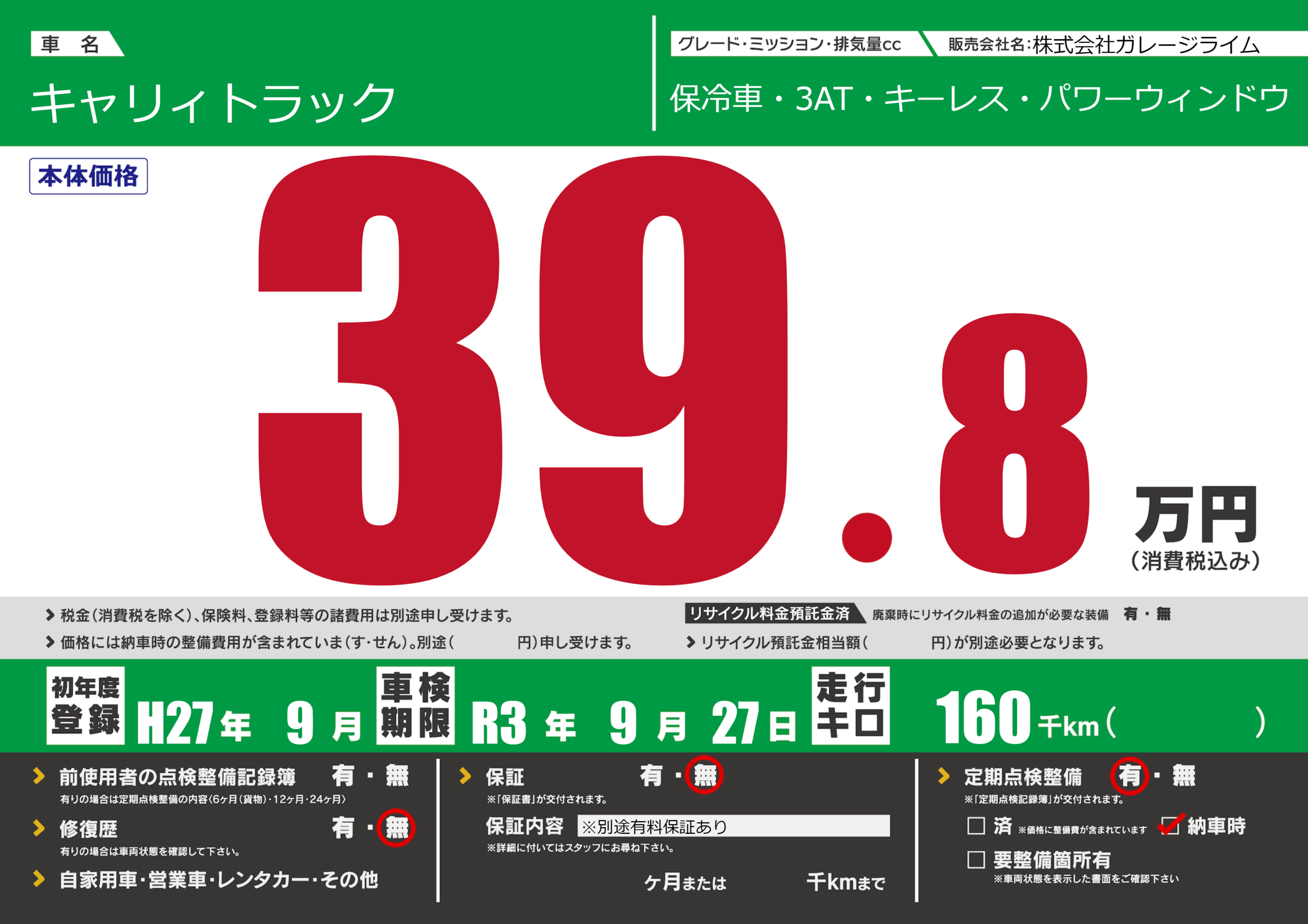 | 車名 | キャリィトラック | グレード ミッション 排気量 |
