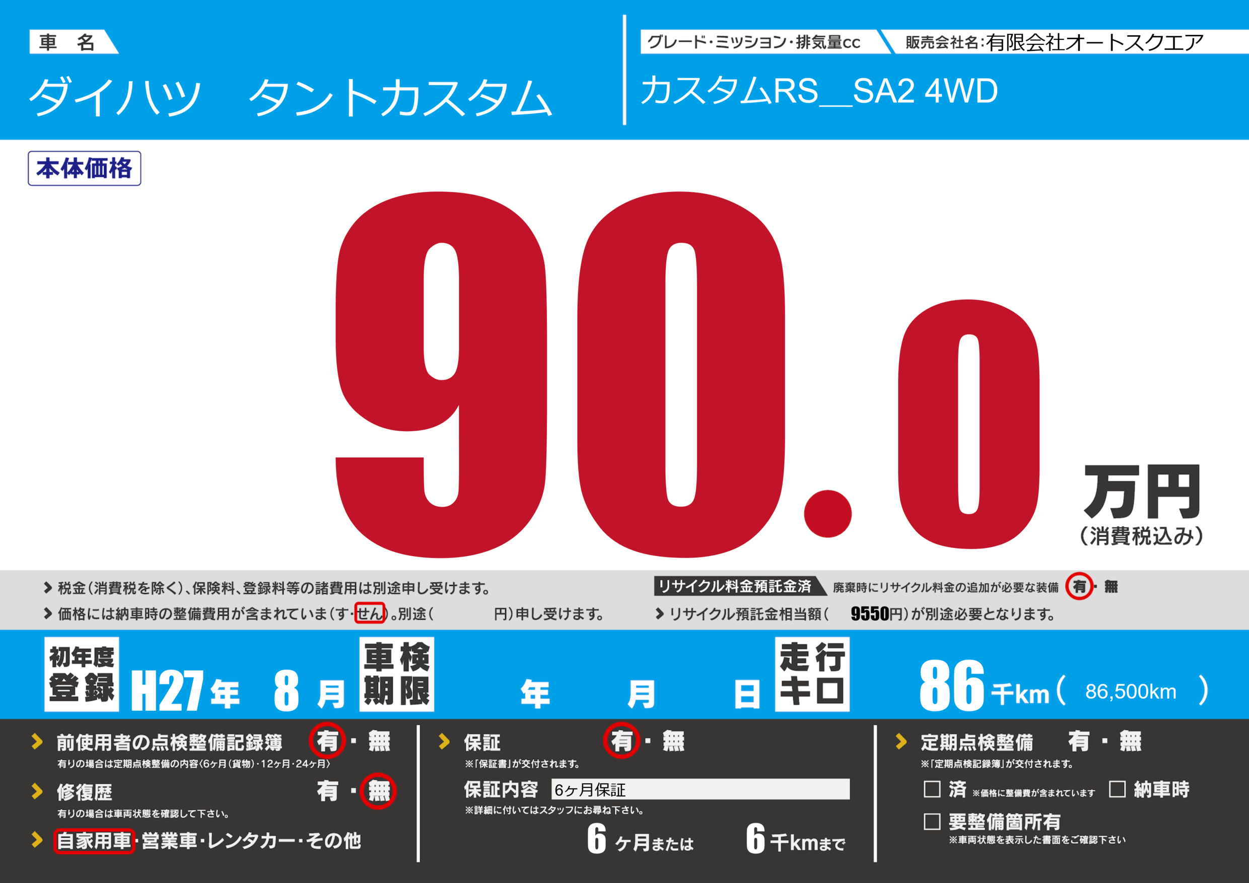 | 車名 | ダイハツ タントカスタム | グレード ミッション 排気量 |