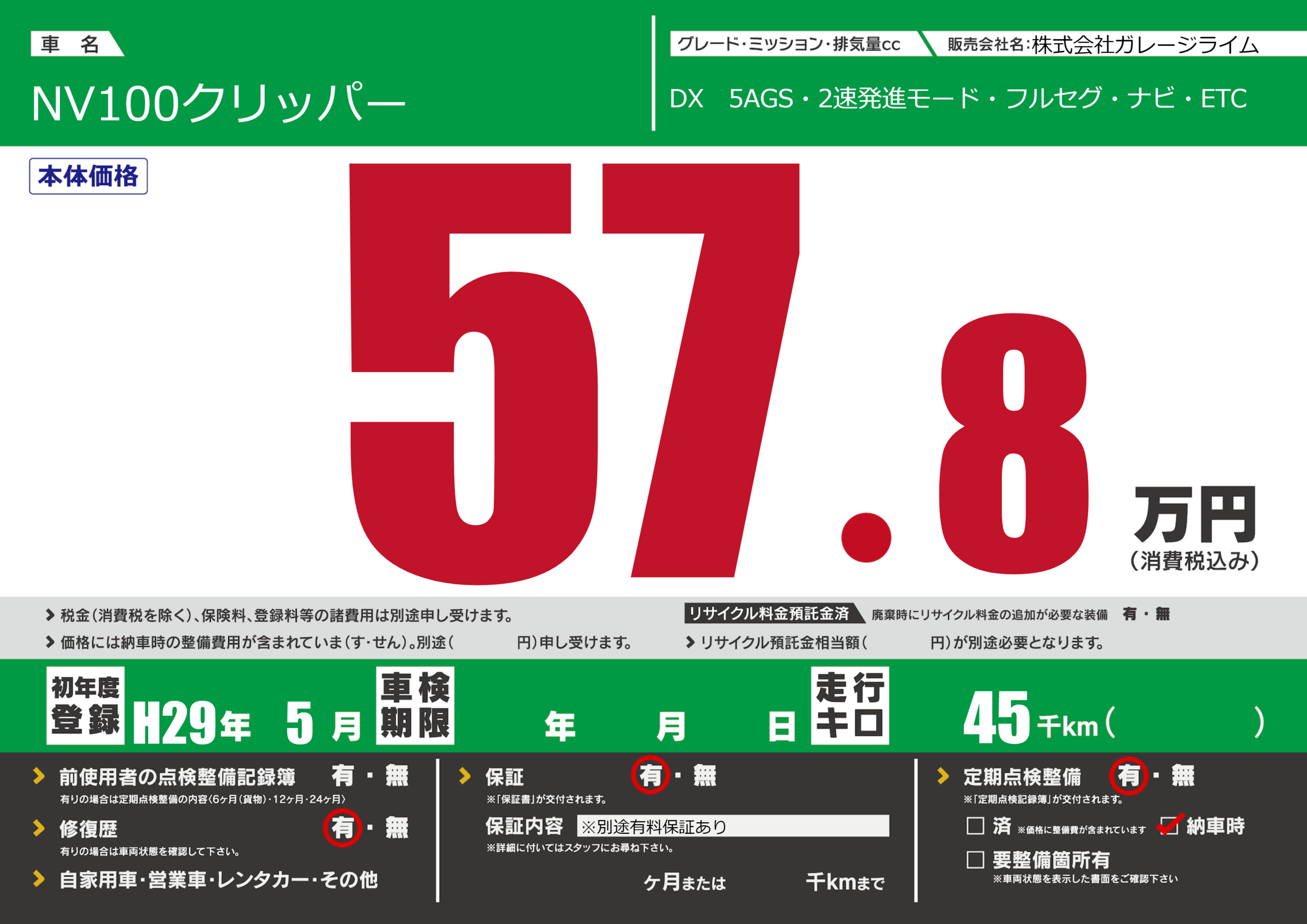 保証付き 保証内容(※別途有料保証あり) ---ヶ月または()千kmまで |
