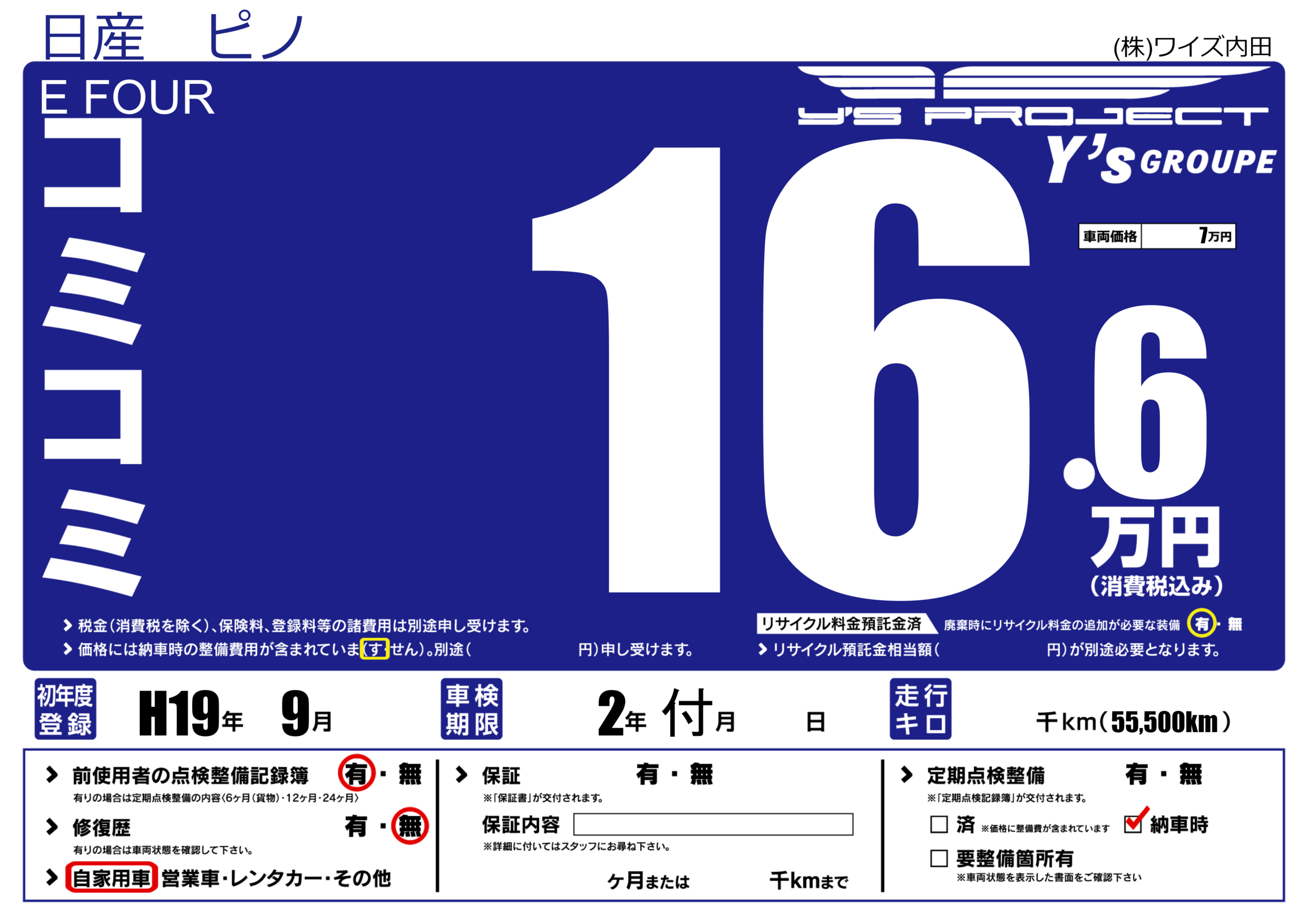 | 車名 | 日産 ピノ | グレード ミッション 排気量 |