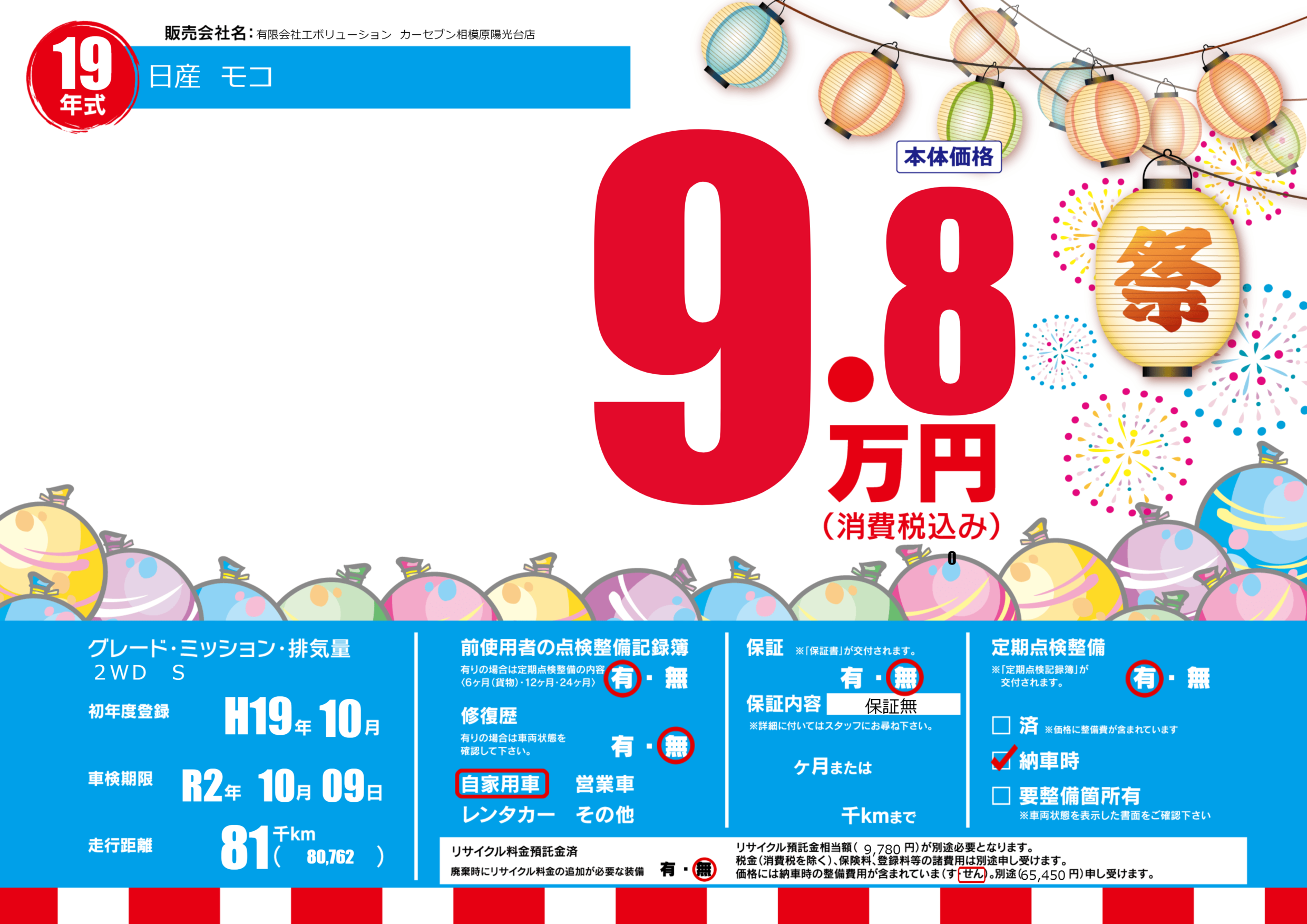 | 車名 | 日産 モコ | グレード ミッション 排気量 |