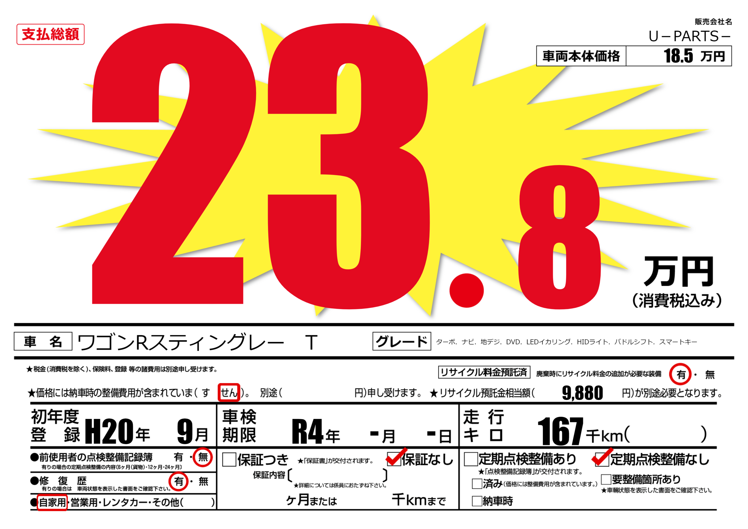 | 走行キロ | 16.7万km | 初年度登録 | H20年9月 |