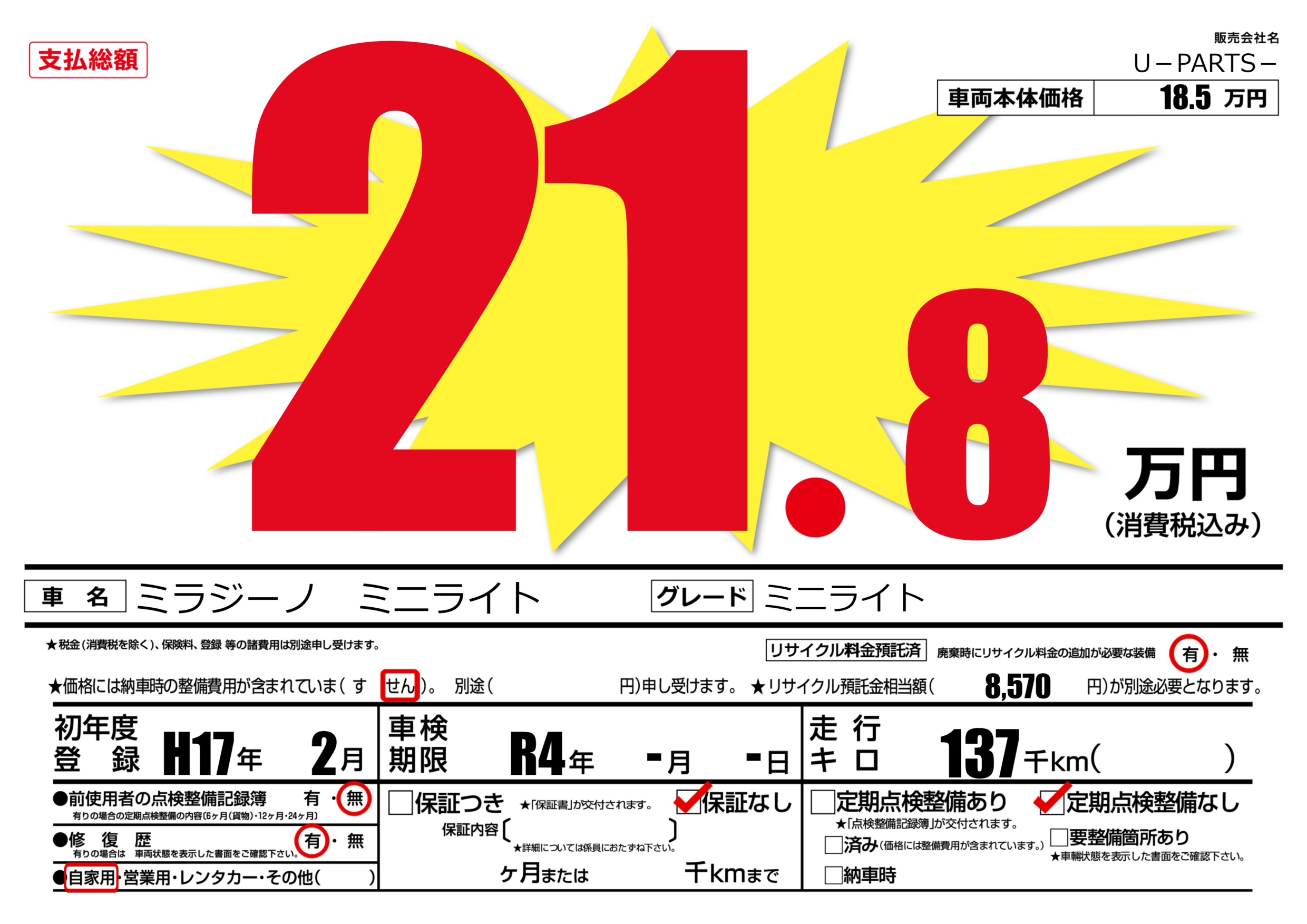 | 車名 | ミラジーノ ミニライト | グレード ミッション 排気量 |
