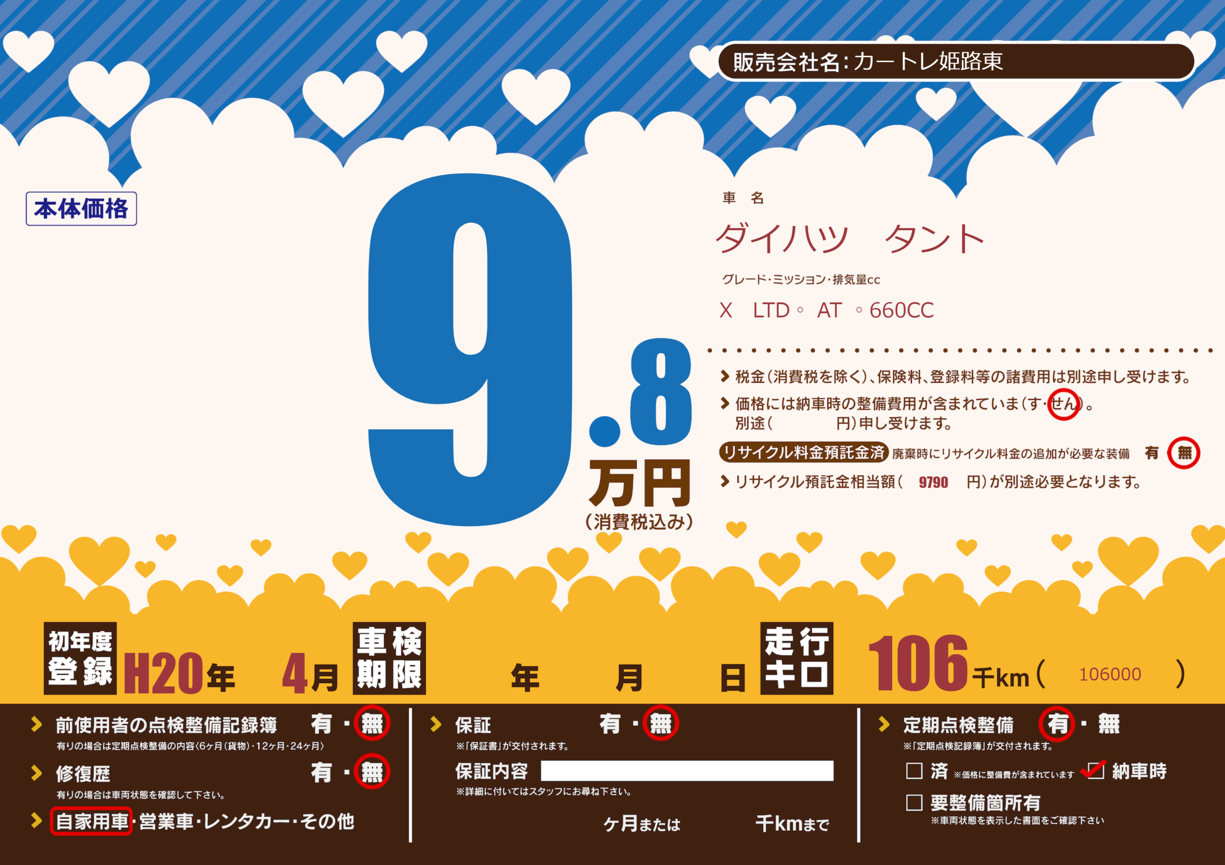 | 車名 | ダイハツ タント | グレード ミッション 排気量 |