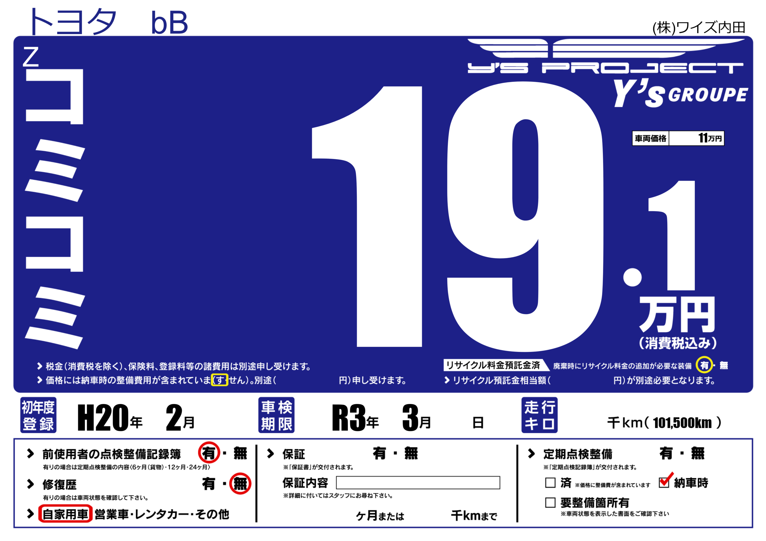 | 車名 | トヨタ bB | グレード ミッション 排気量 |
