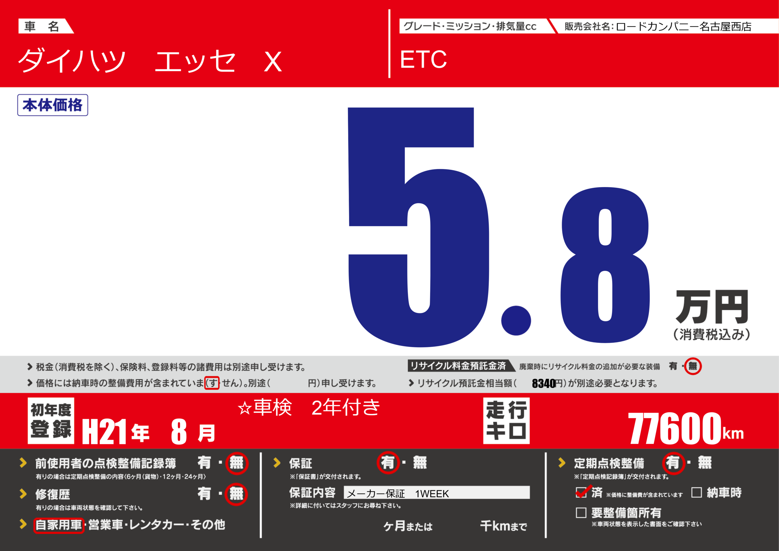 | 車名 | ダイハツ エッセ X | グレード ミッション 排気量 |