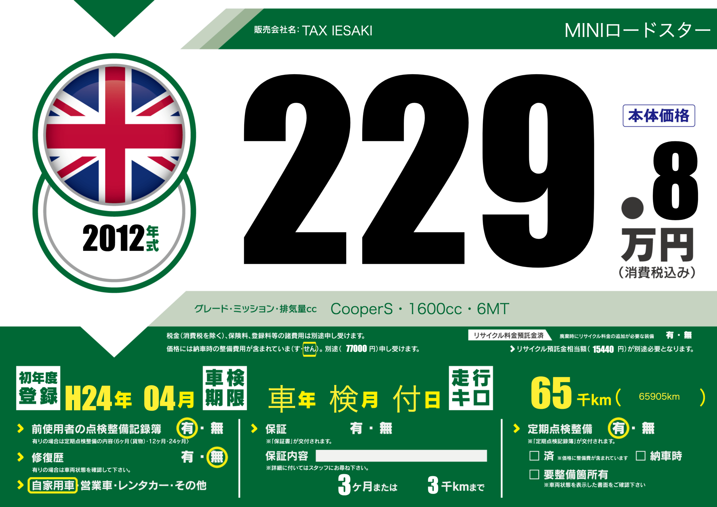| 車名 | MINIロードスター | グレード ミッション 排気量 |