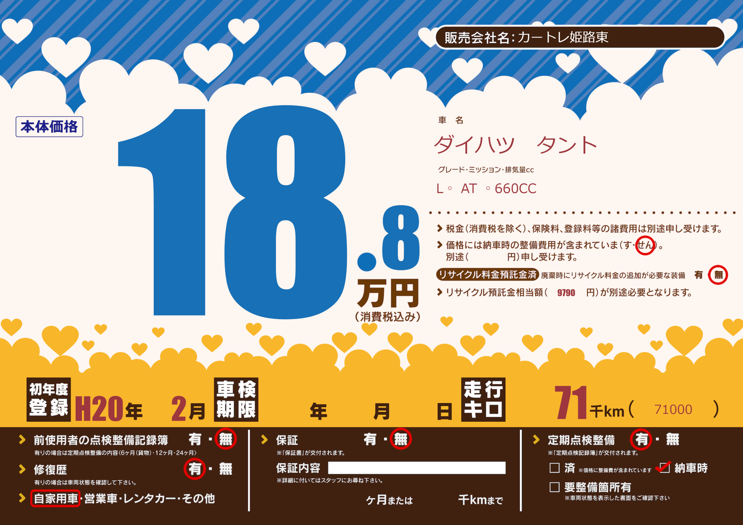 | 車名 | ダイハツ タント | グレード ミッション 排気量 |