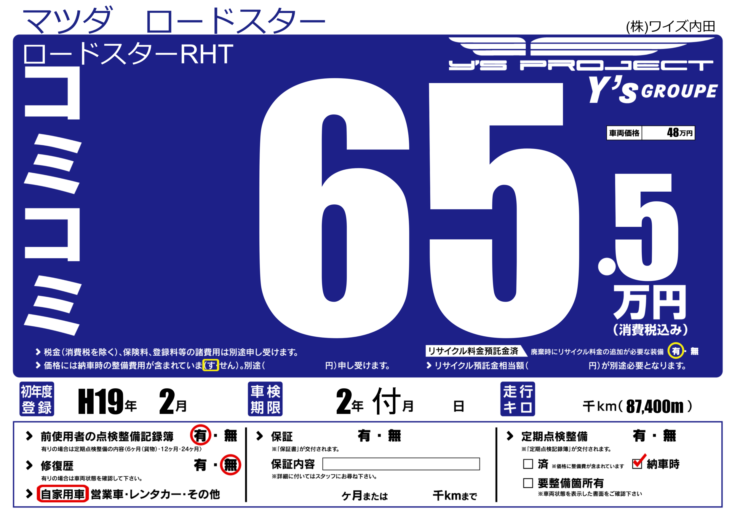 | 走行キロ | - | 初年度登録 | H19年2月 |