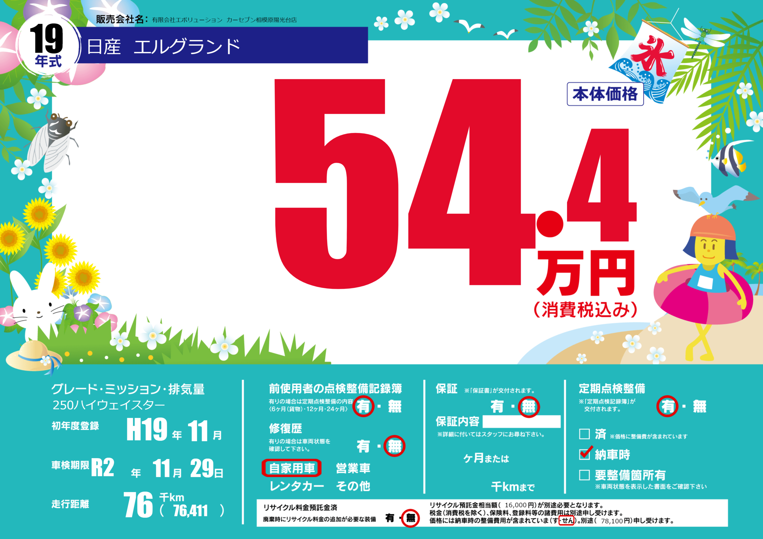 | 走行キロ | 7.6万km | 初年度登録 | H19年11月 |