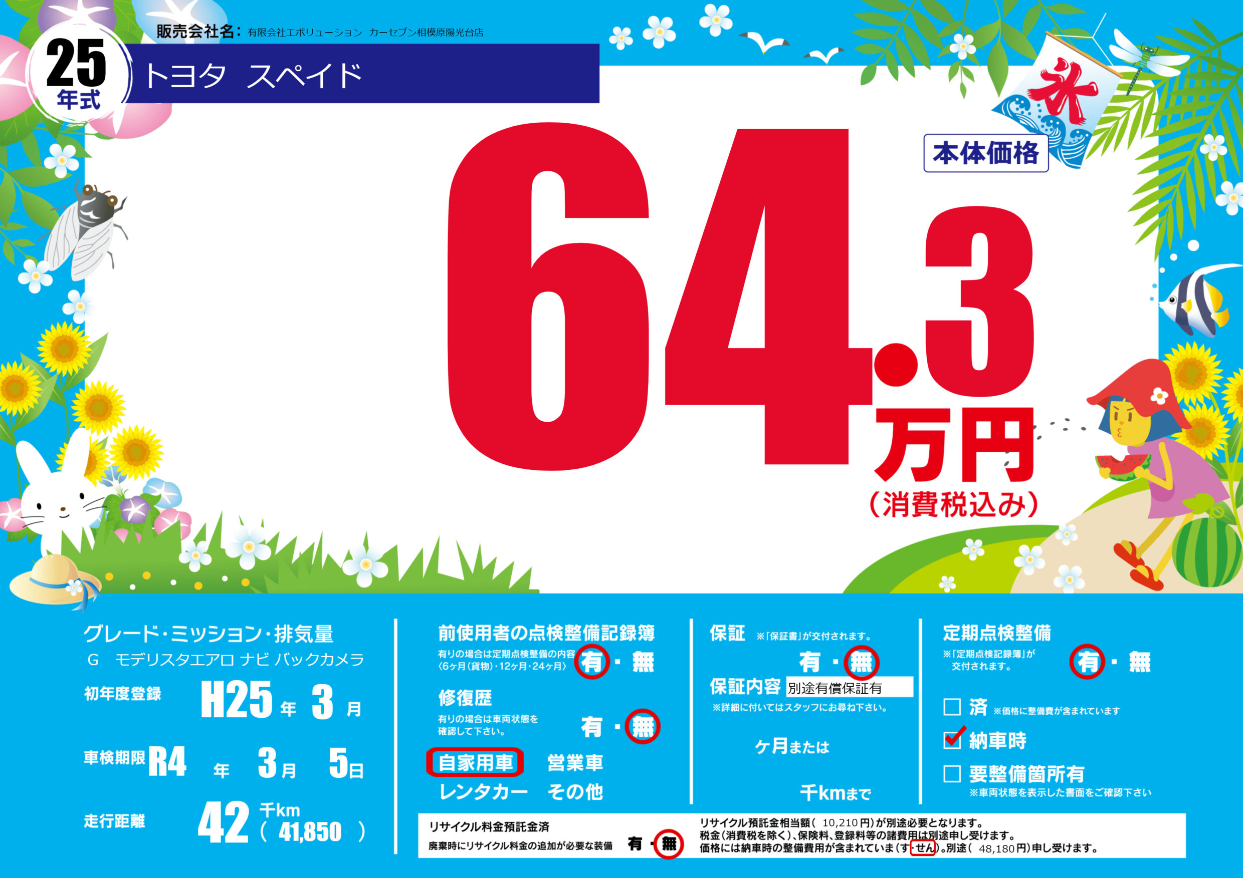 | 車名 | トヨタ スペイド | グレード ミッション 排気量 |