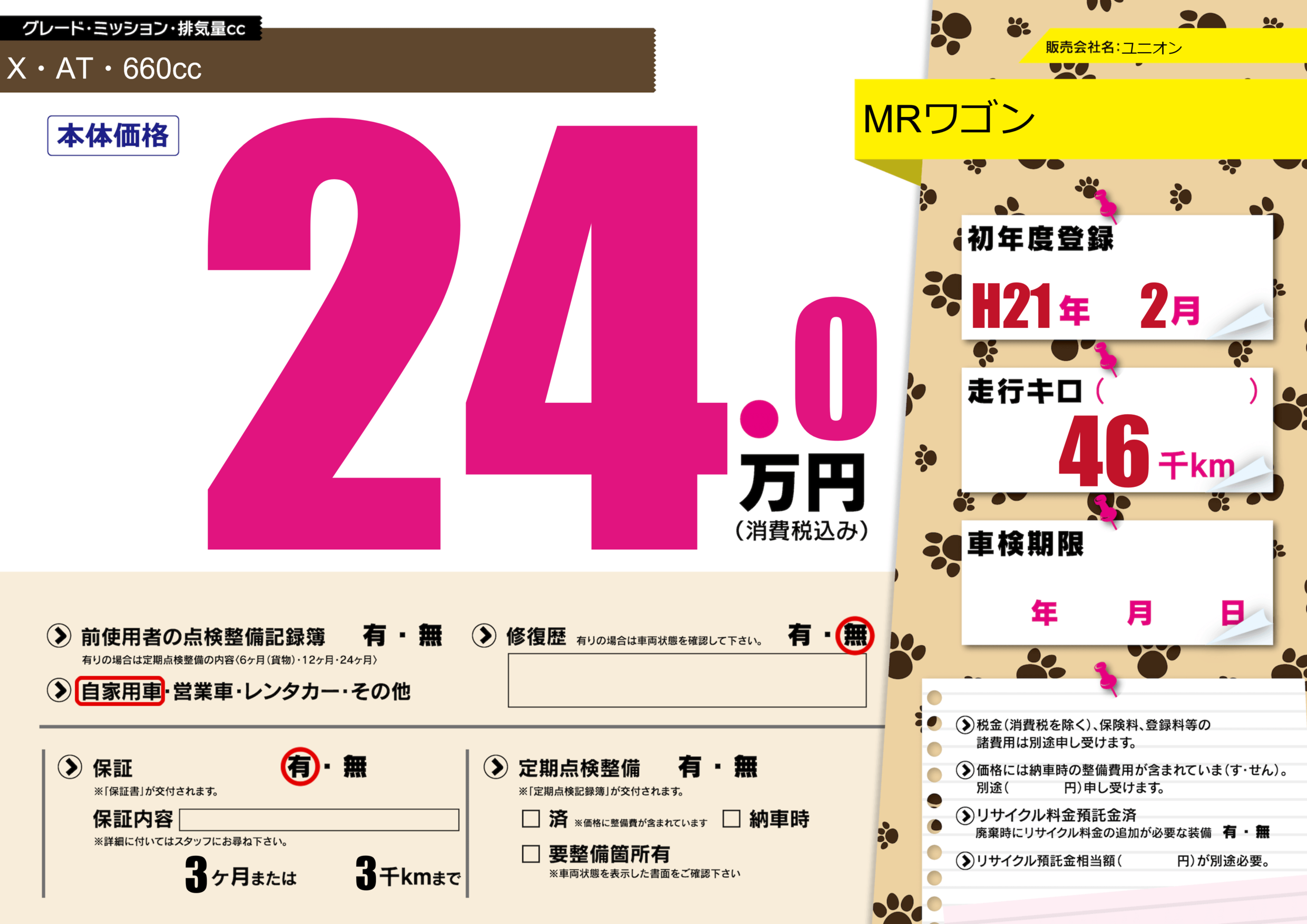 | 車名 | MRワゴン | グレード ミッション 排気量 |