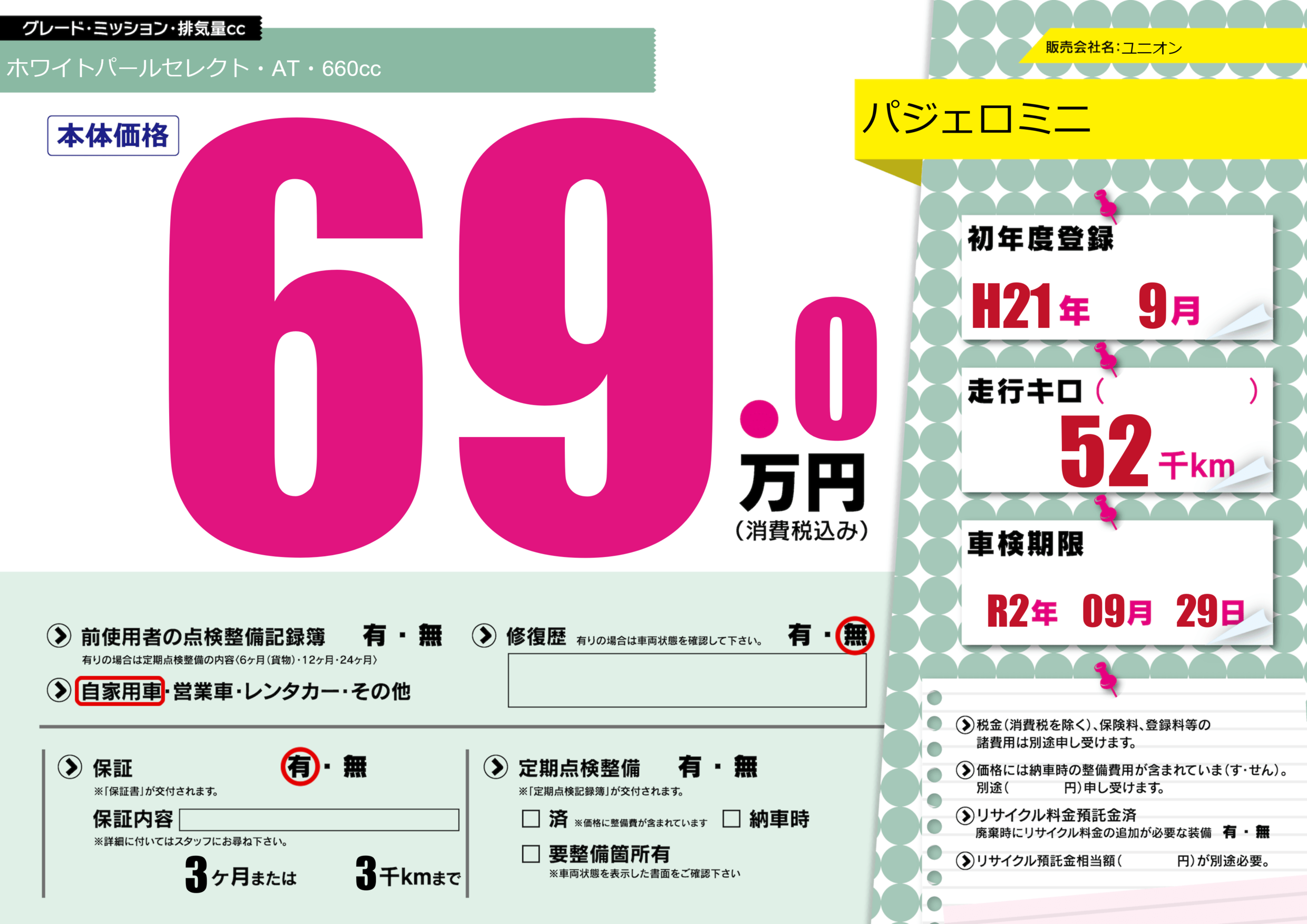 | 車名 | パジェロミニ | グレード ミッション 排気量 |
