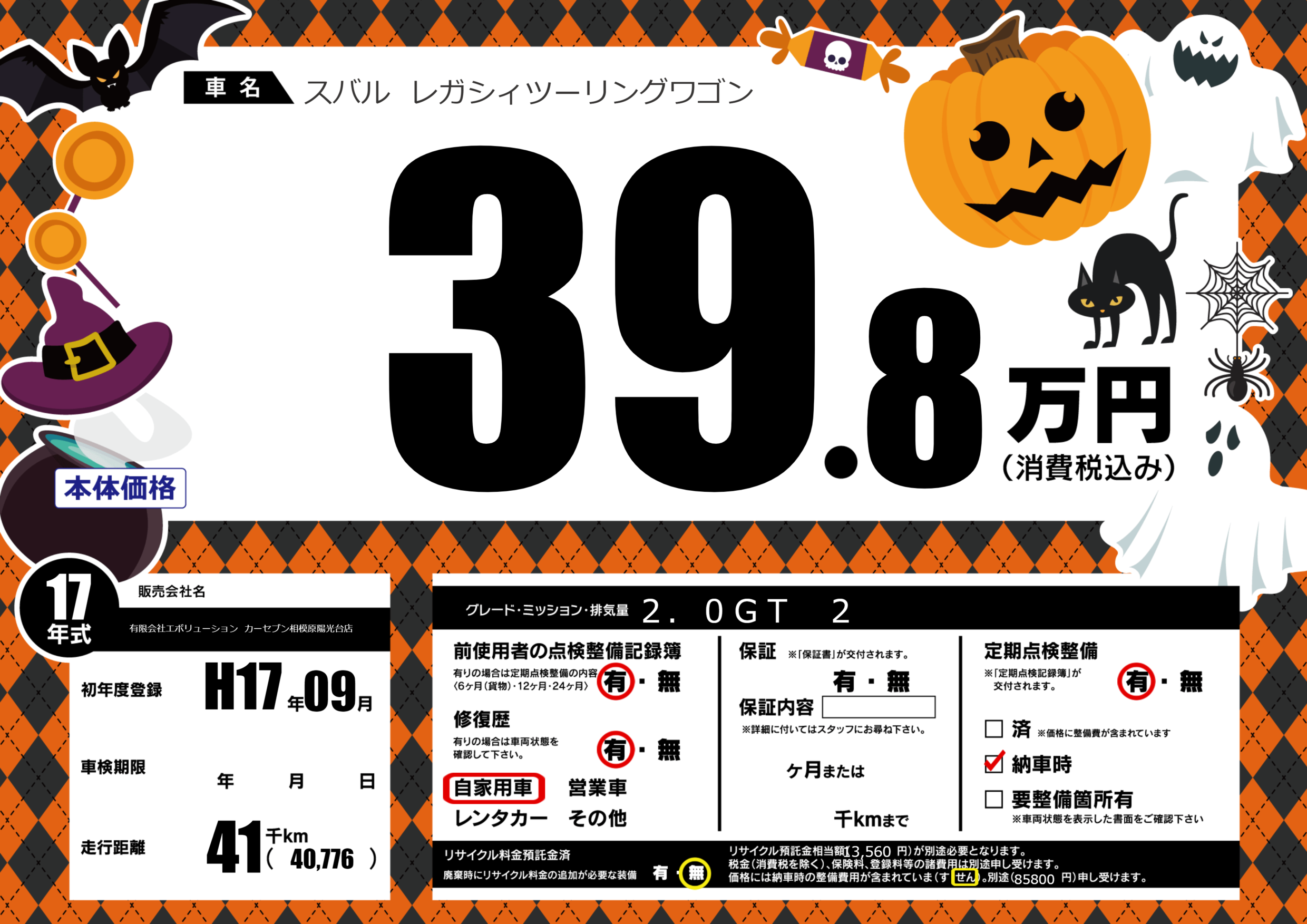 | 車名 | スバル レガシィツーリングワゴン | グレード ミッション 排気量 |