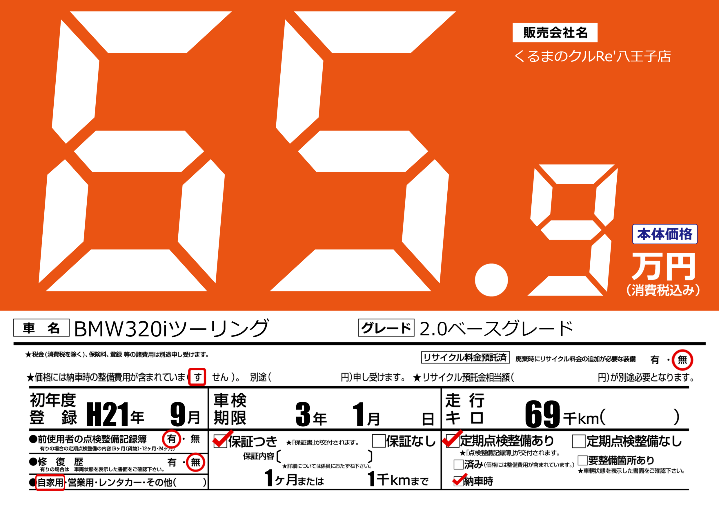 | 車名 | BMW320iツーリング | グレード ミッション 排気量 |
