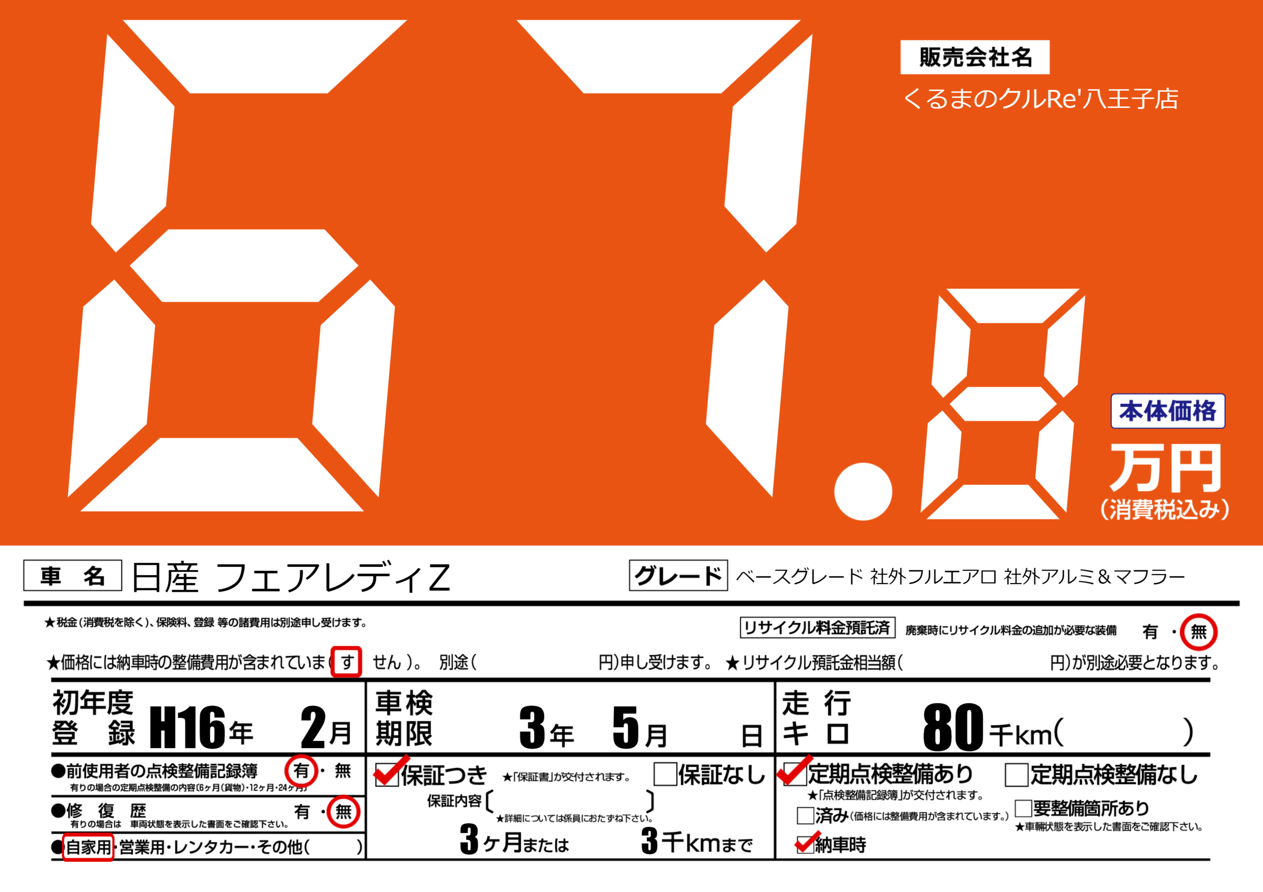 | 走行キロ | 8万km | 初年度登録 | H16年2月 |
