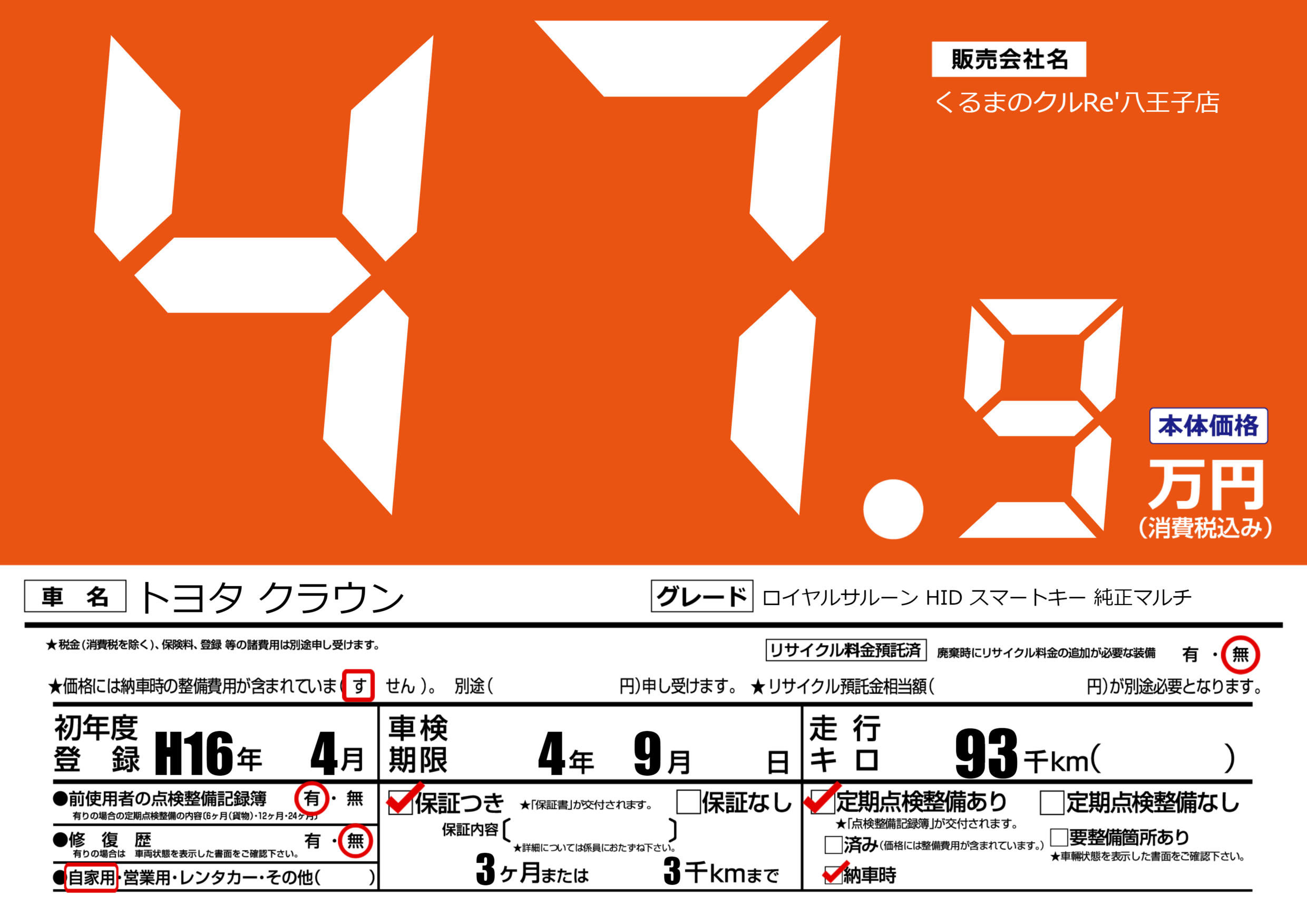 | 走行キロ | 9.3万km | 初年度登録 | H16年4月 |