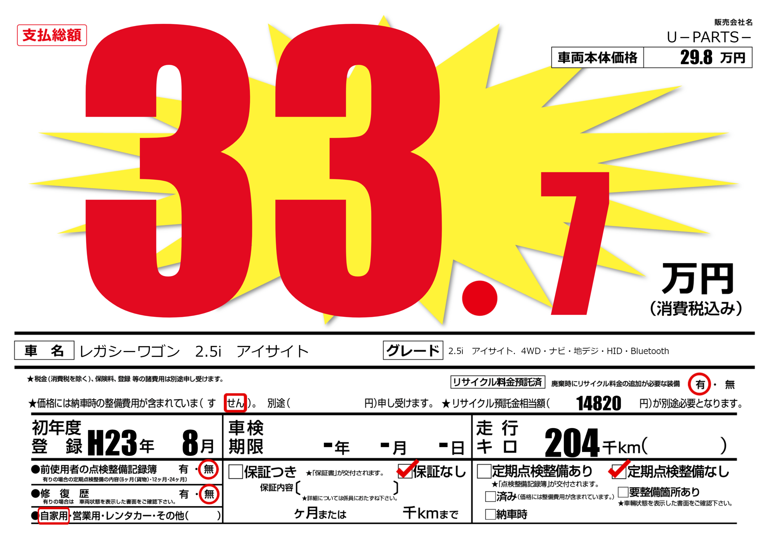 | 車名 | レガシーワゴン 2.5i アイサイト | グレード ミッション 排気量 |