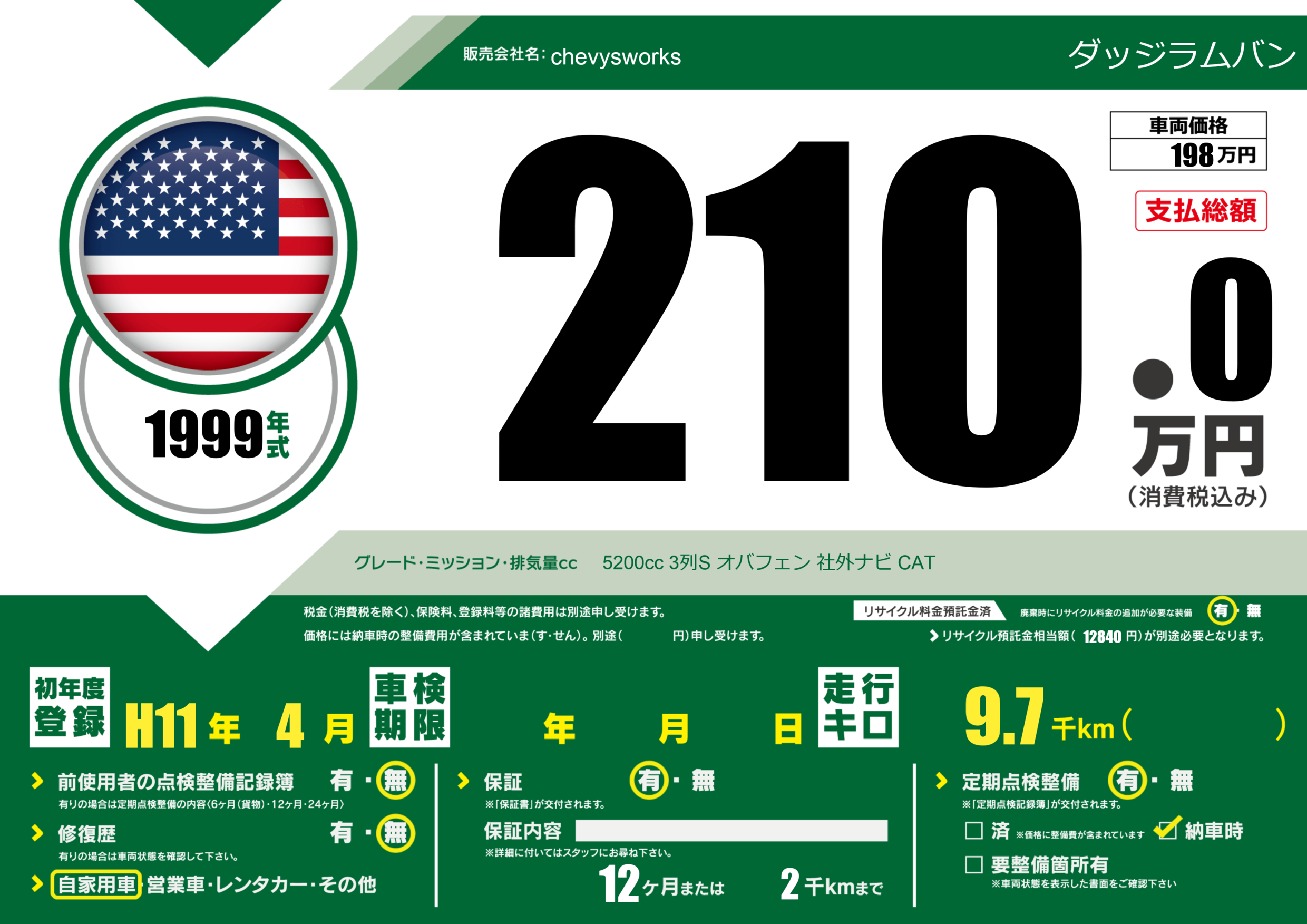 | 車名 | ダッジラムバン | グレード ミッション 排気量 |