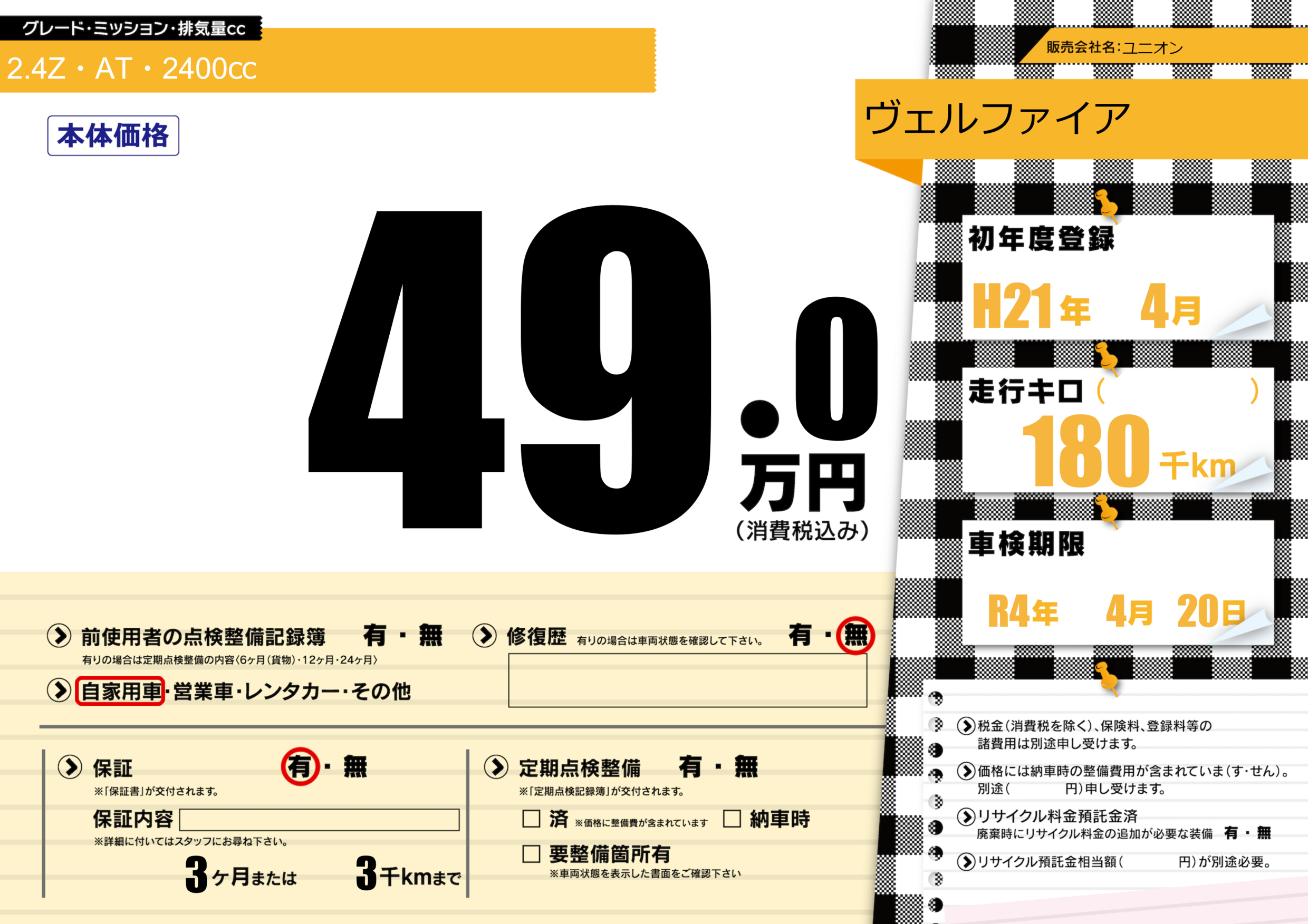 | 車名 | ヴェルファイア | グレード ミッション 排気量 |