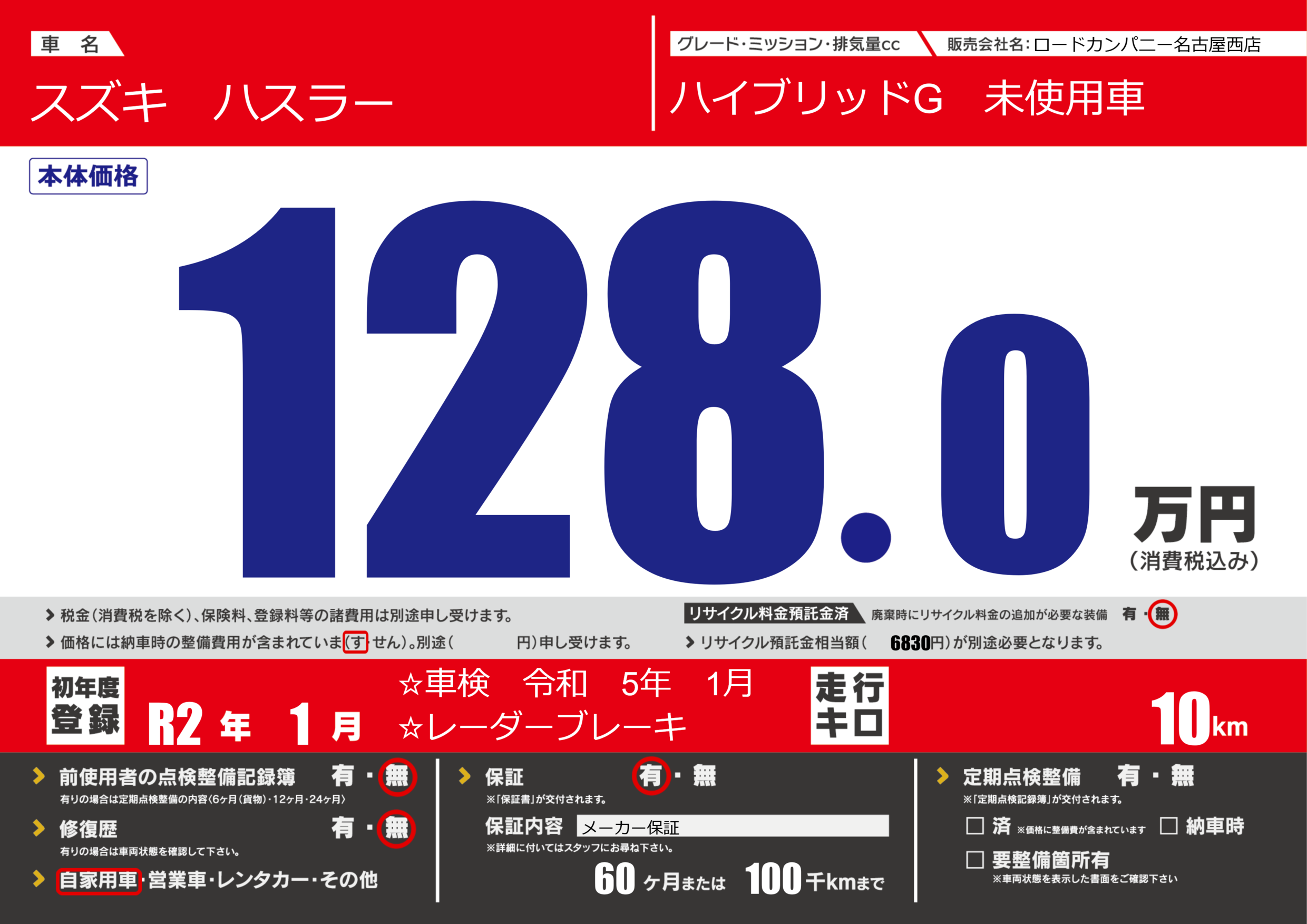 | 車名 | スズキ ハスラー | グレード ミッション 排気量 |