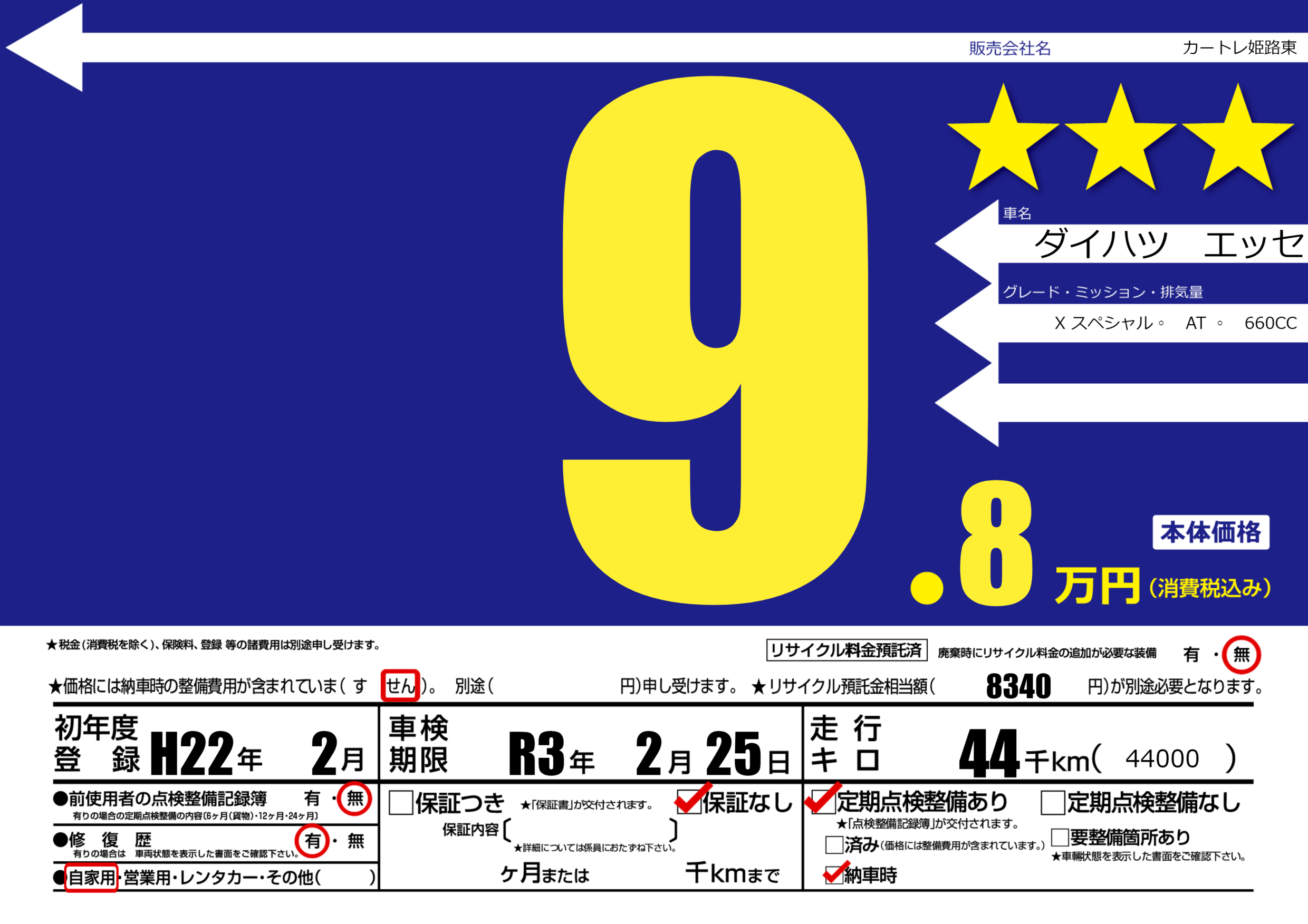 | 車名 | ダイハツ エッセ | グレード ミッション 排気量 |