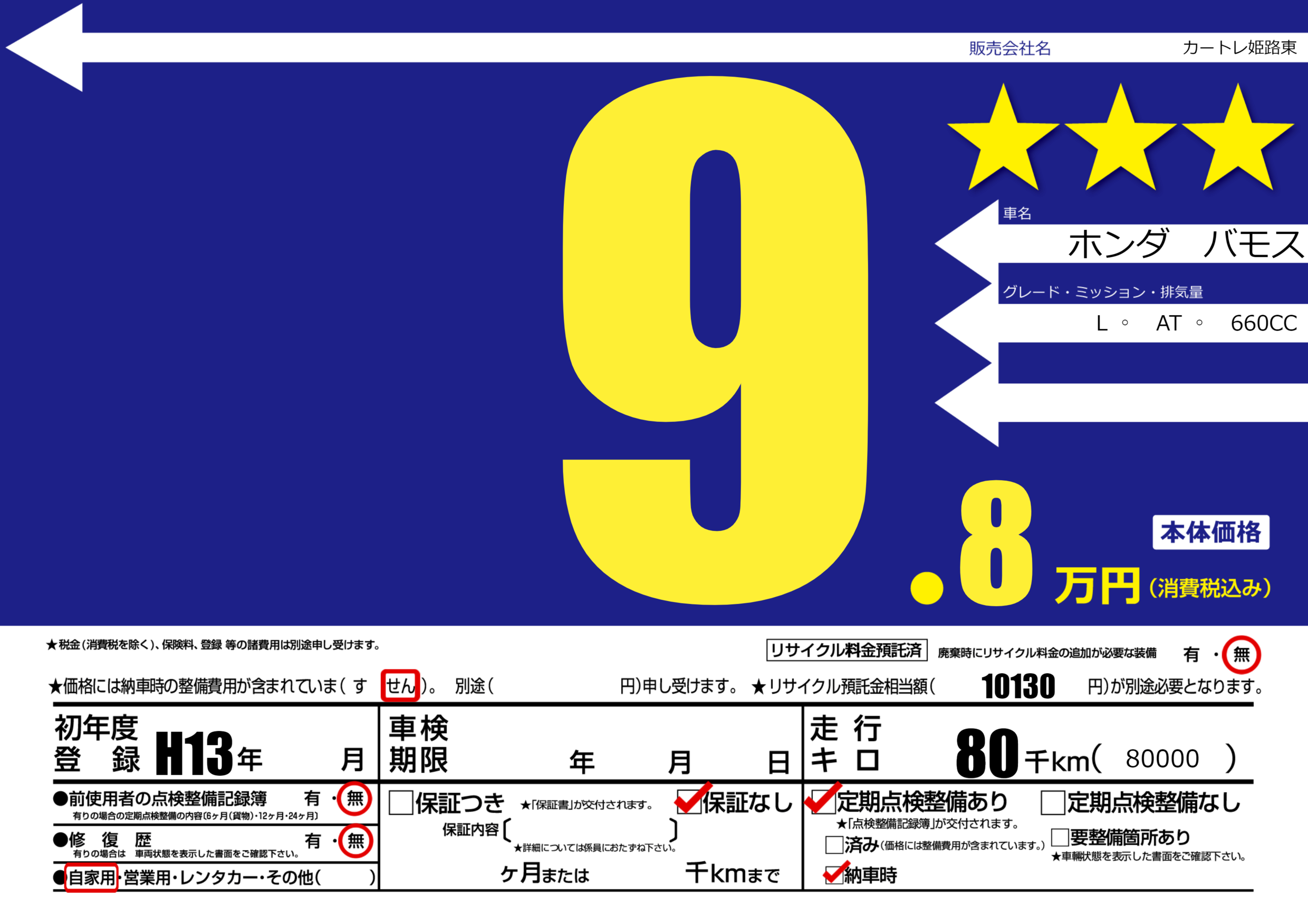 | 車名 | ホンダ バモス | グレード ミッション 排気量 |