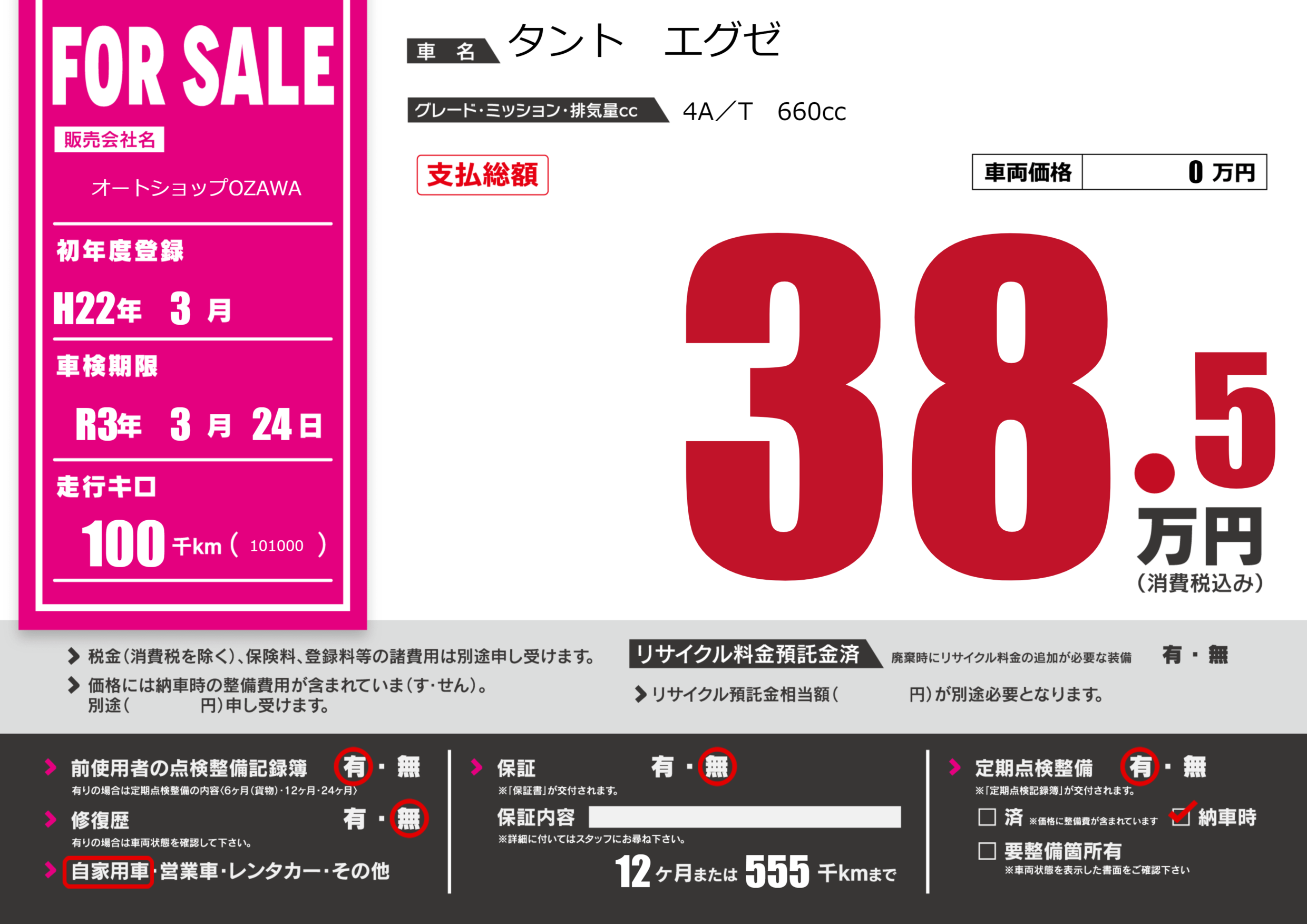 | 定期点検整備 | 定期点検整備あり 納車時あり | ||