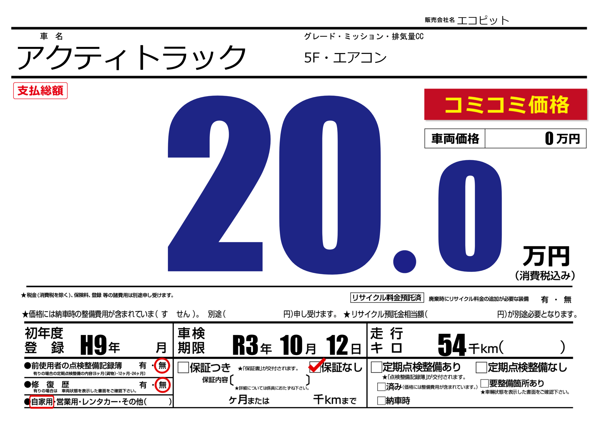 なし | 車検制限 | R3年10月12月 |