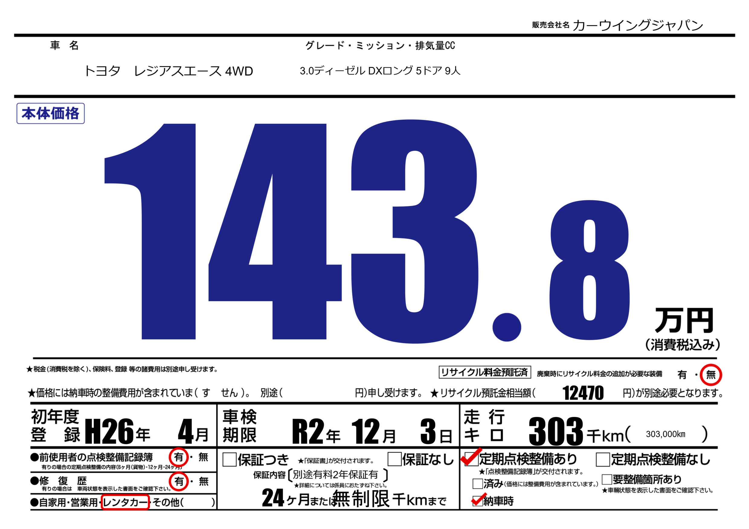 なし | 車検制限 | R2年12月3月 |