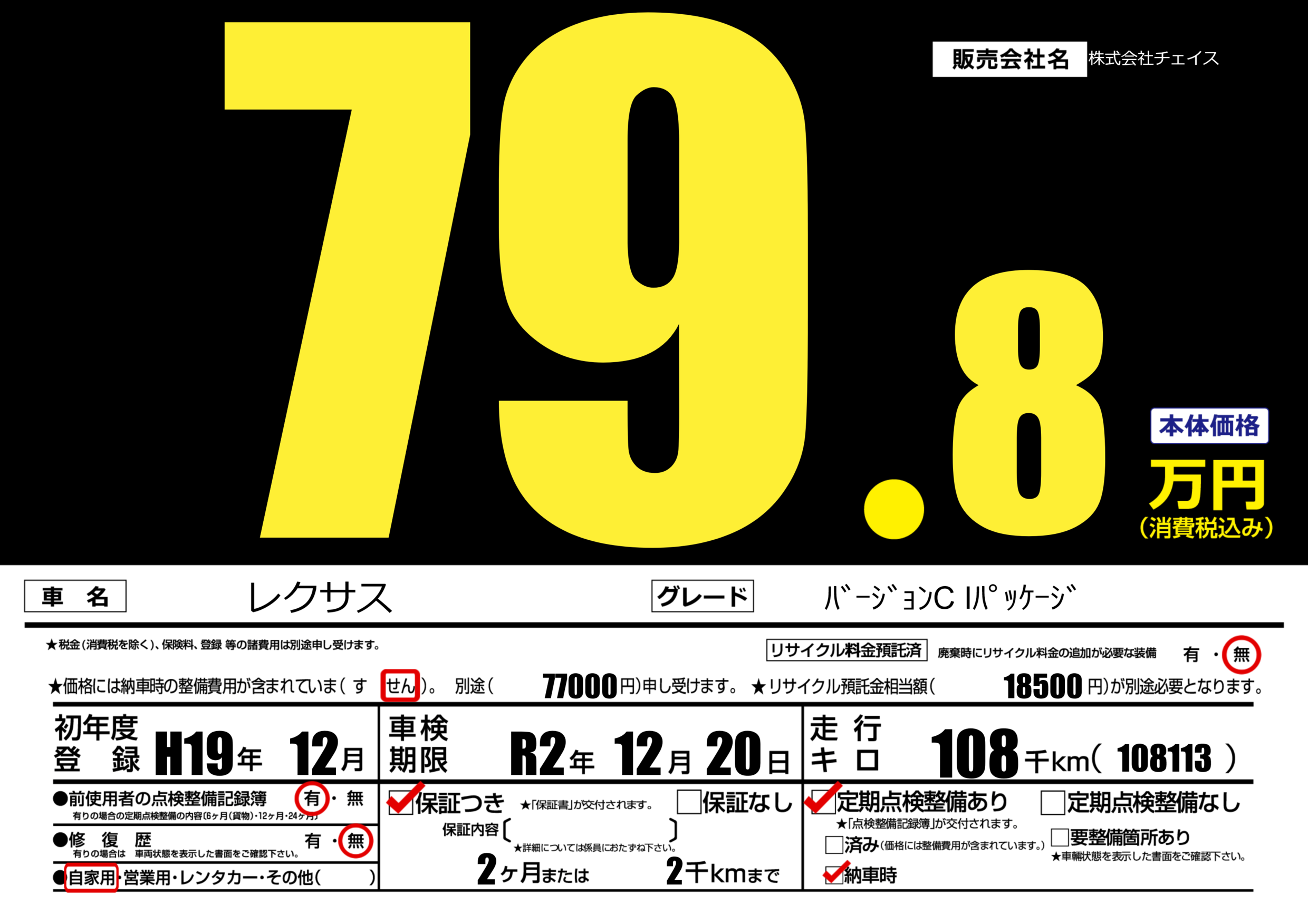 | 走行キロ | 10.8万km | 初年度登録 | H19年12月 |