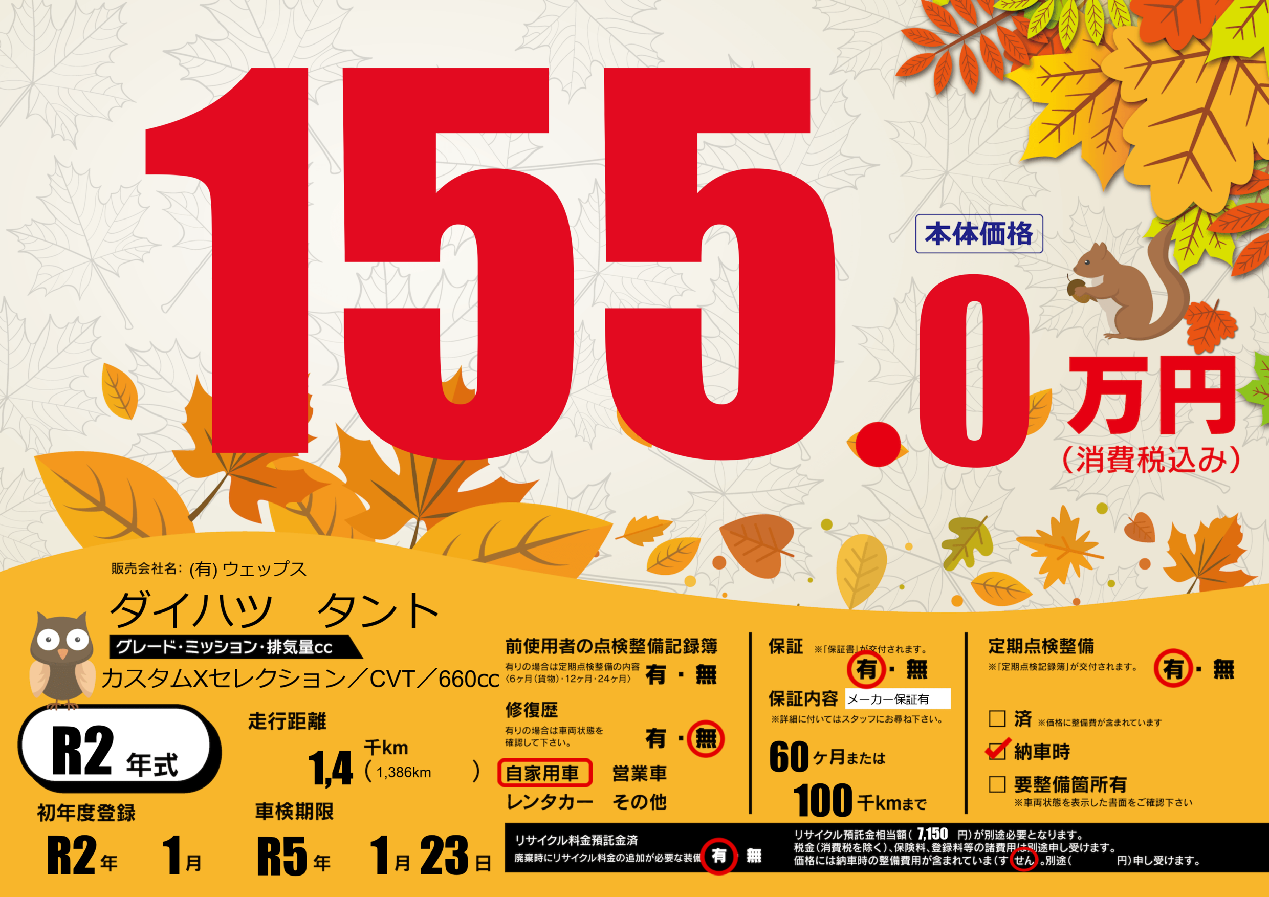 | 車名 | ダイハツ タント | グレード ミッション 排気量 |