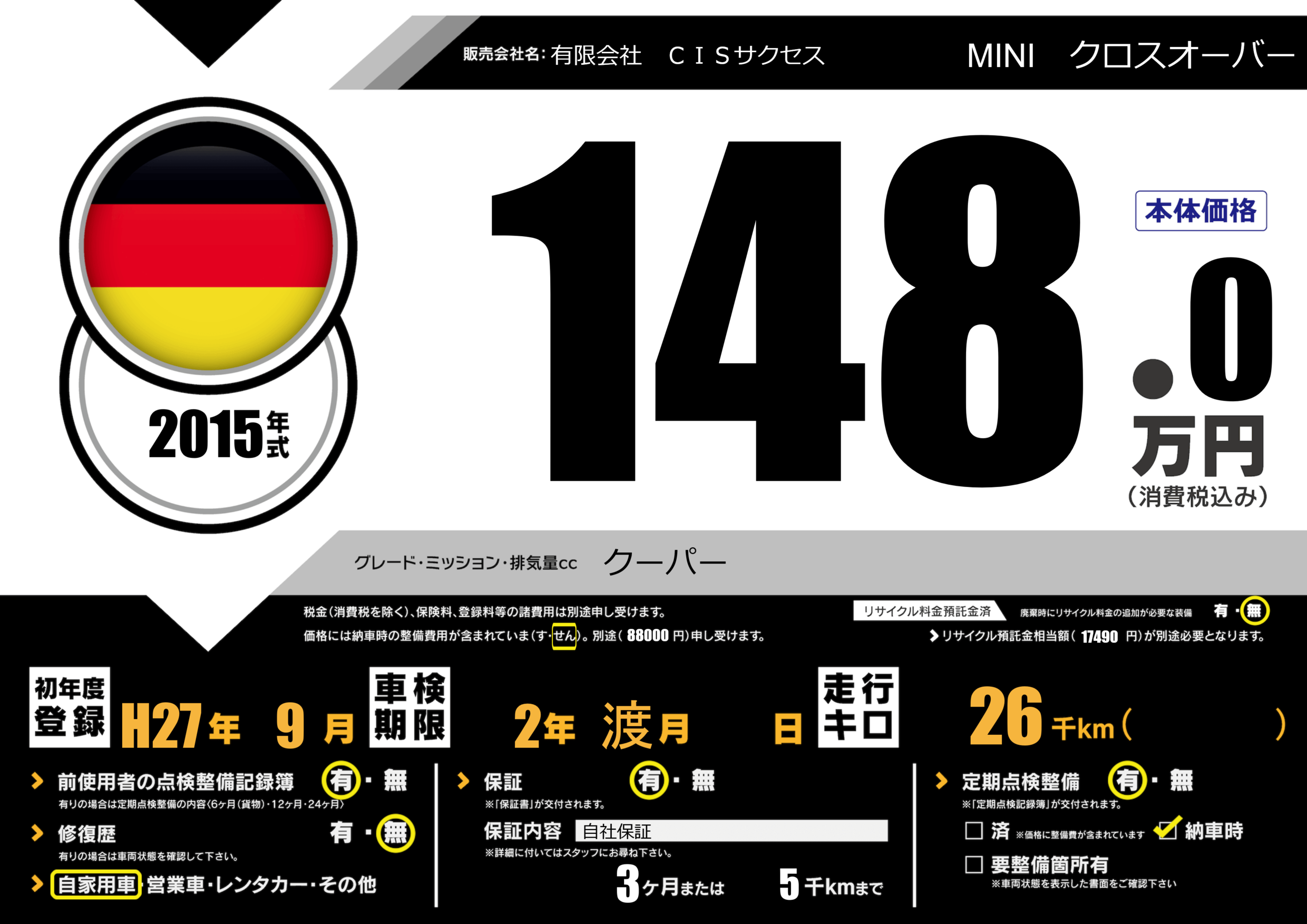 | 車名 | MINI クロスオーバー | グレード ミッション 排気量 |