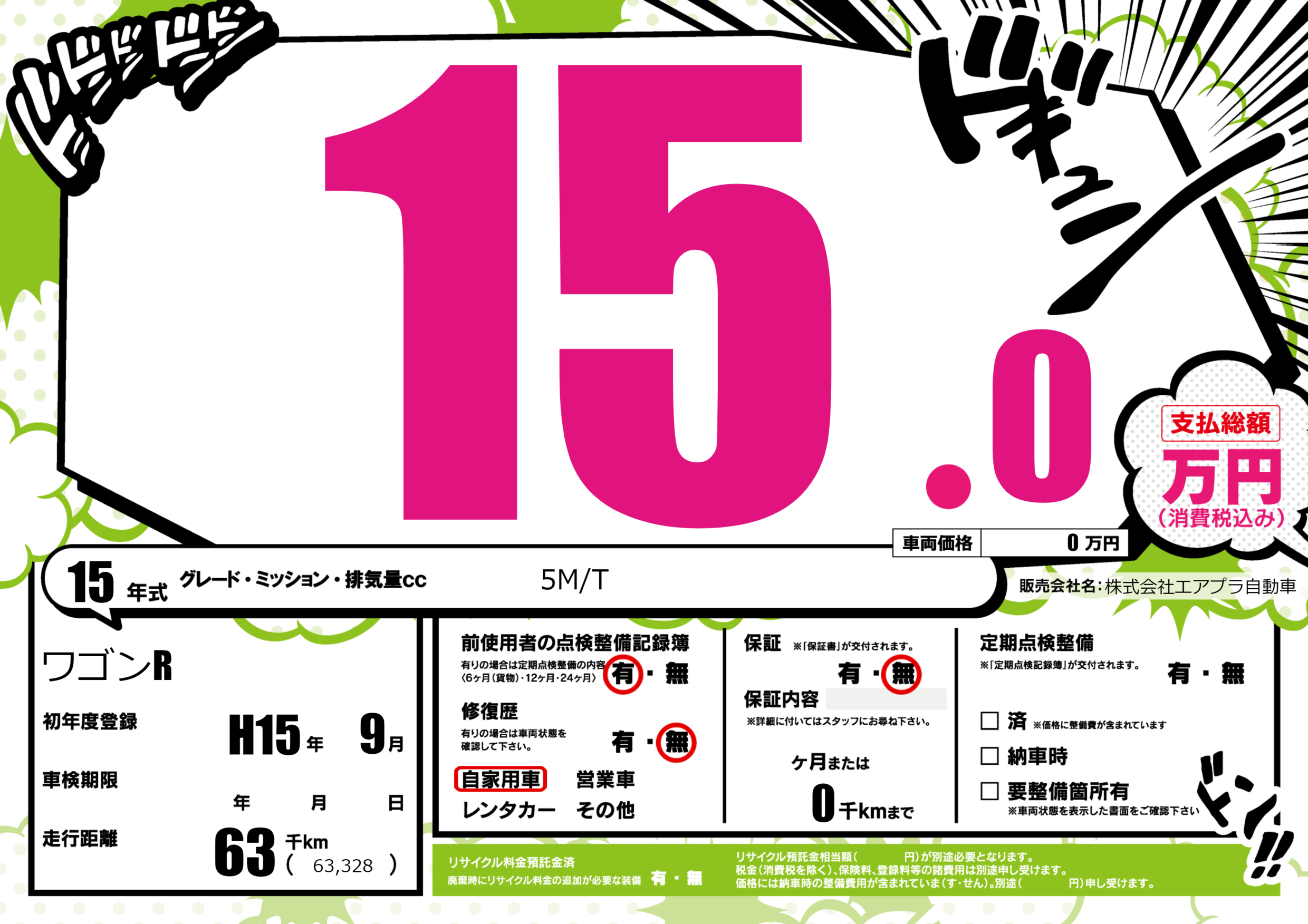 | 走行キロ | 6.3万km | 初年度登録 | H15年9月 |