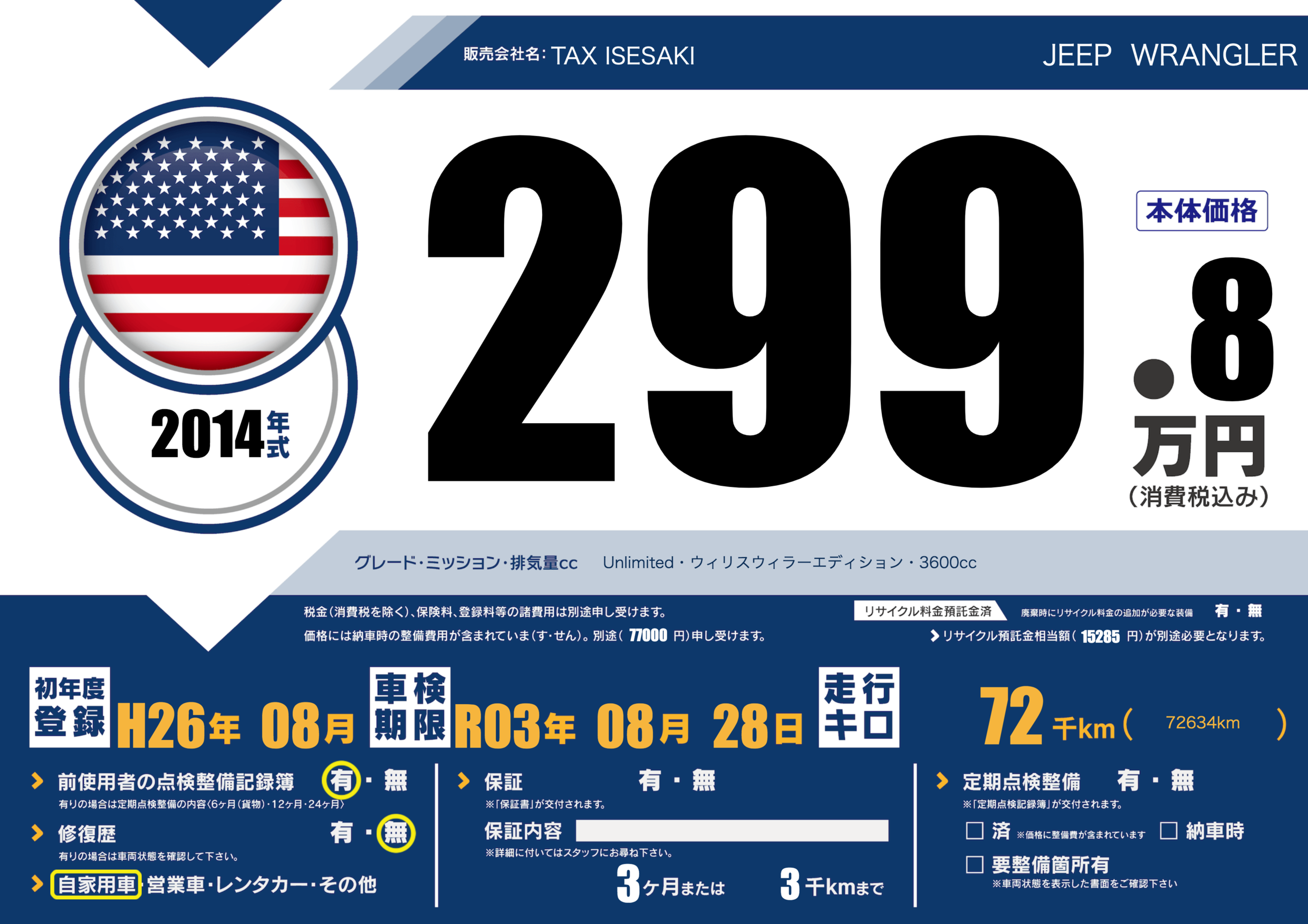 | 車名 | JEEP WRANGLER | グレード ミッション 排気量 |