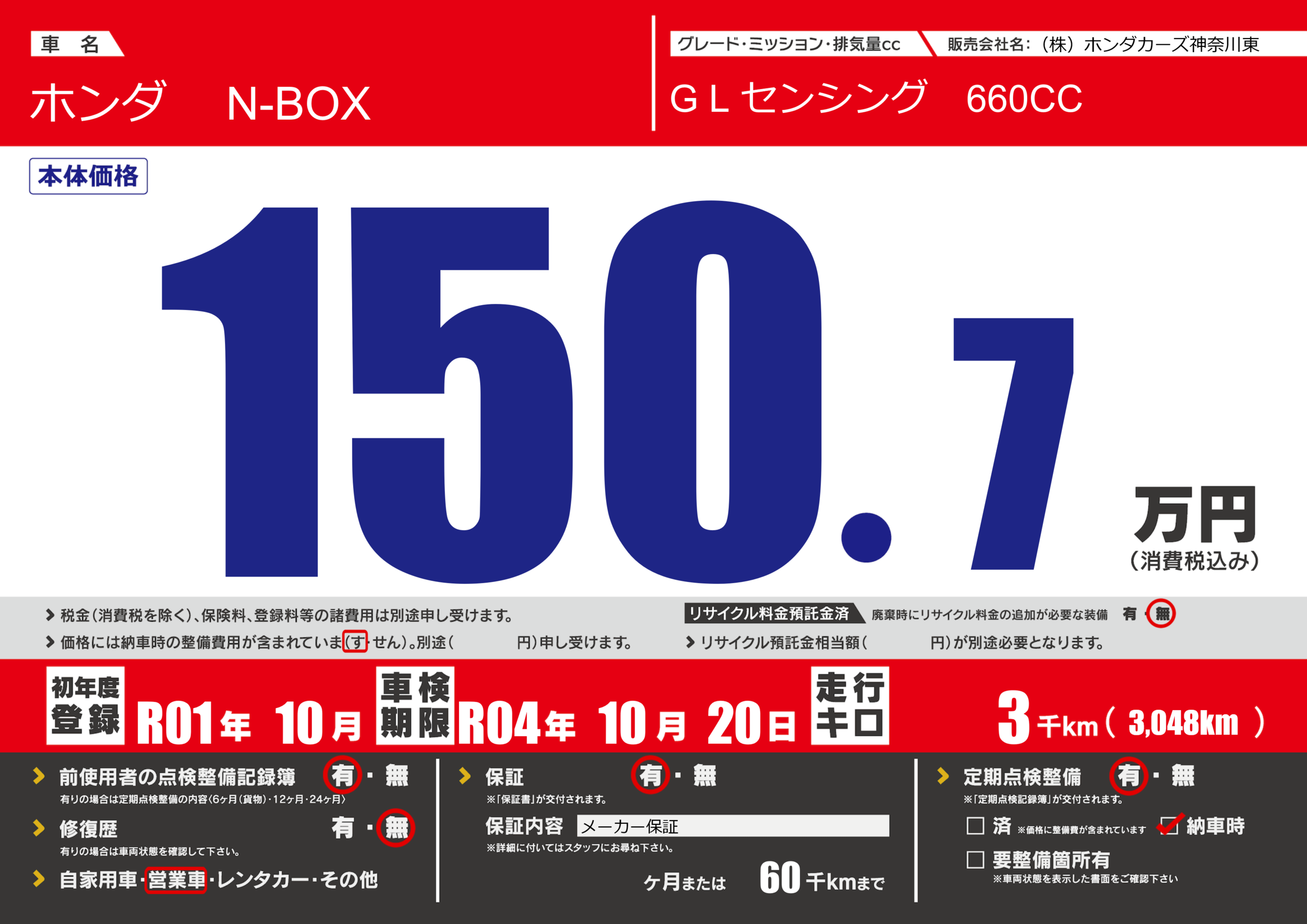 | 車名 | ホンダ N-BOX | グレード ミッション 排気量 |