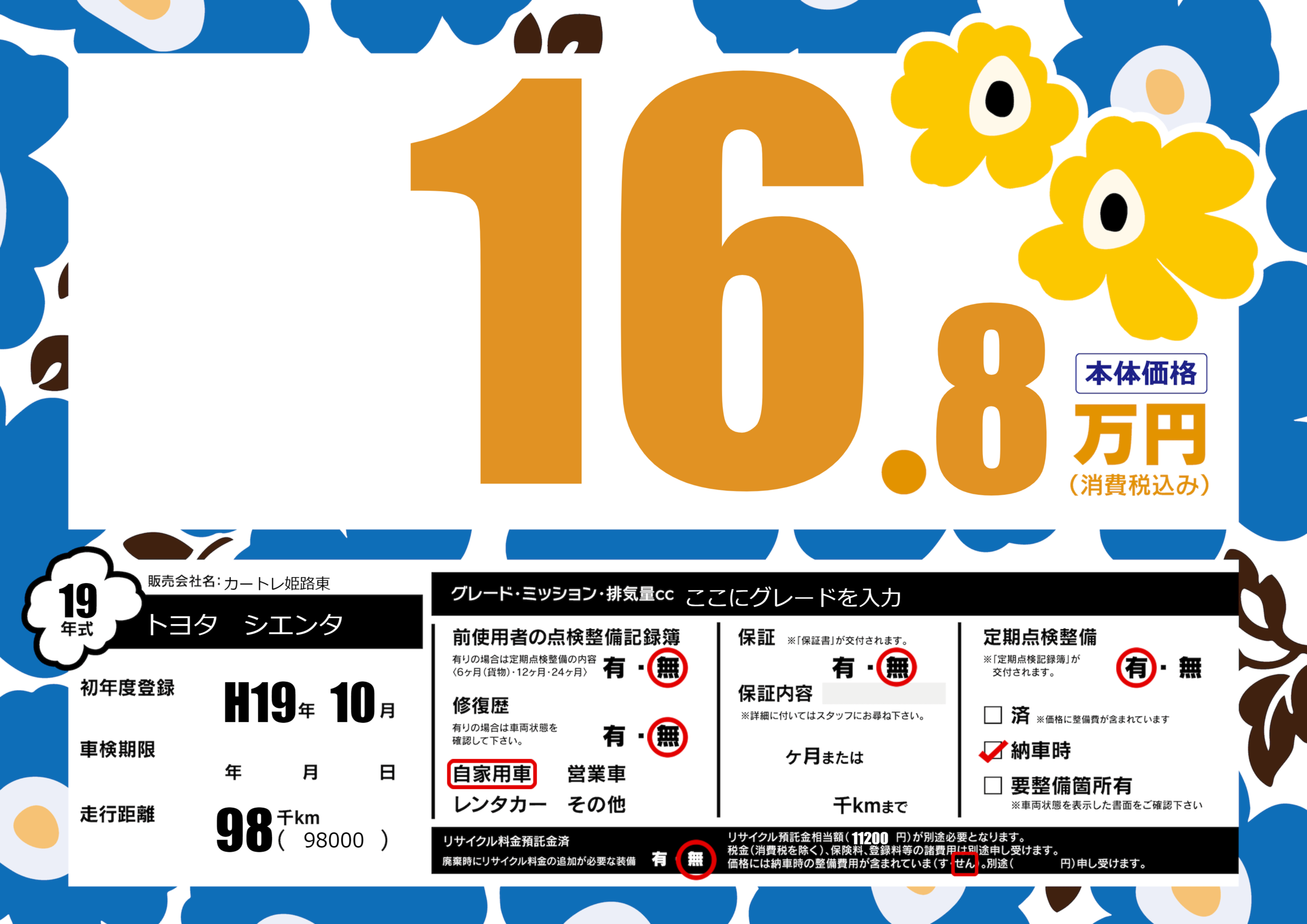 | 車名 | トヨタ シエンタ | グレード ミッション 排気量 |