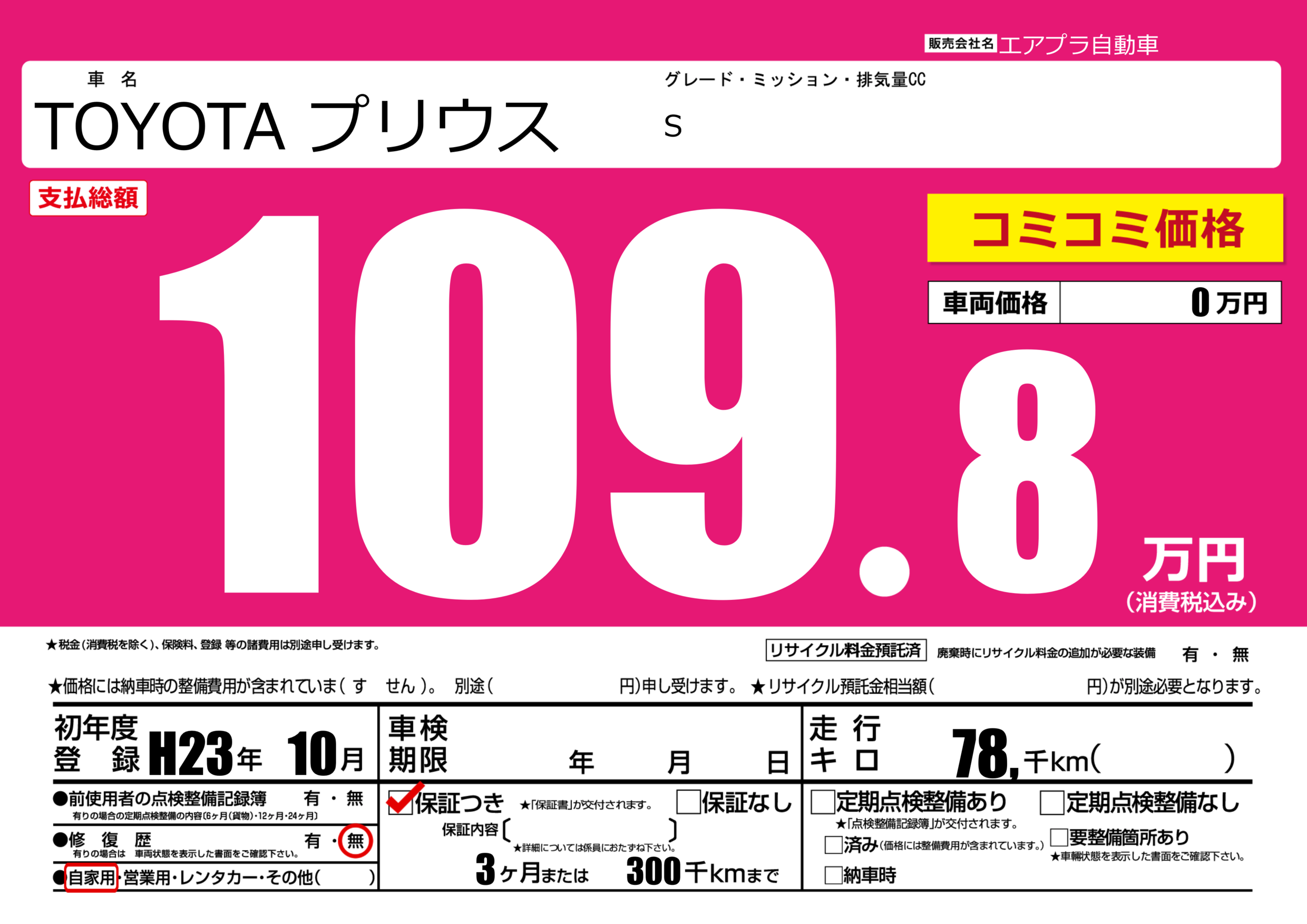 | 車名 | TOYOTA プリウス | グレード ミッション 排気量 |