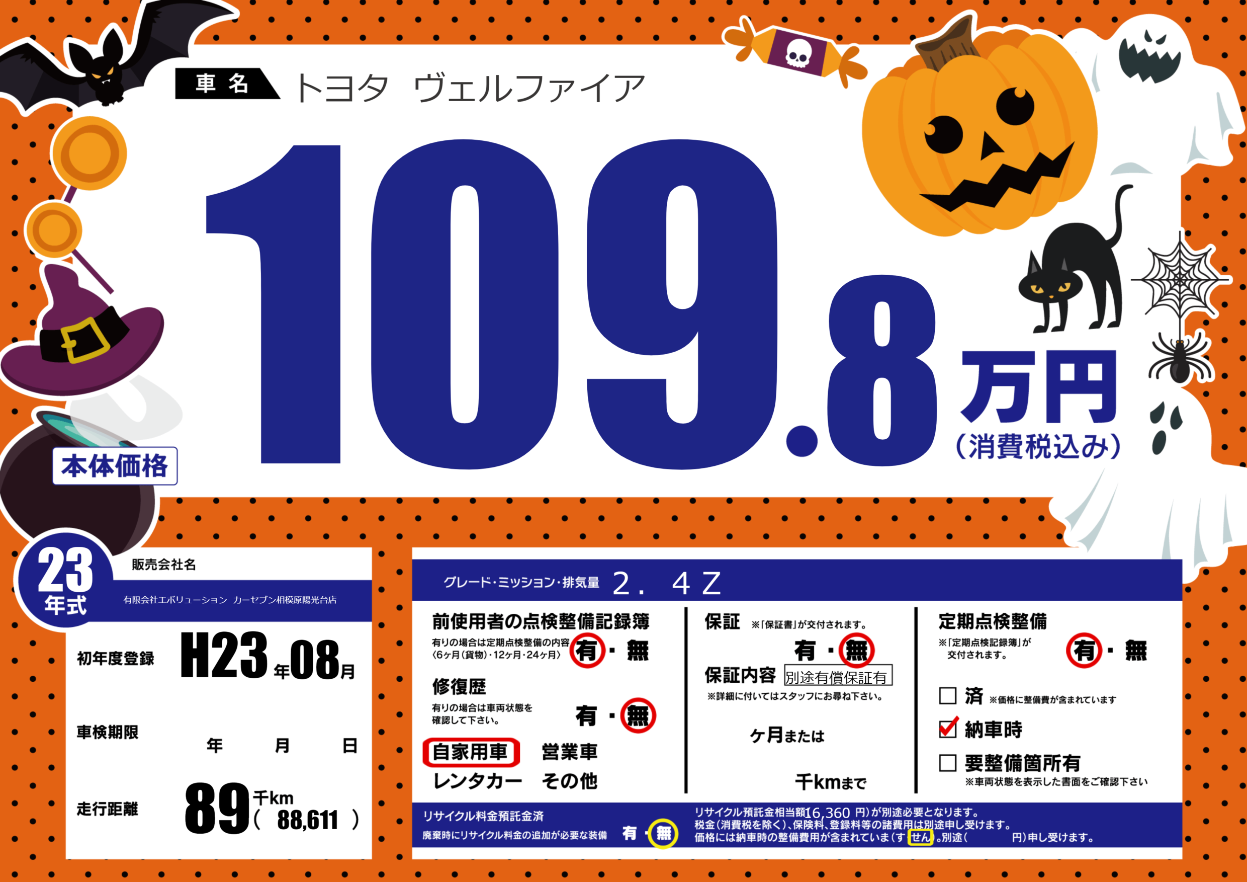 | 走行キロ | 8.9万km | 初年度登録 | H23年08月 |