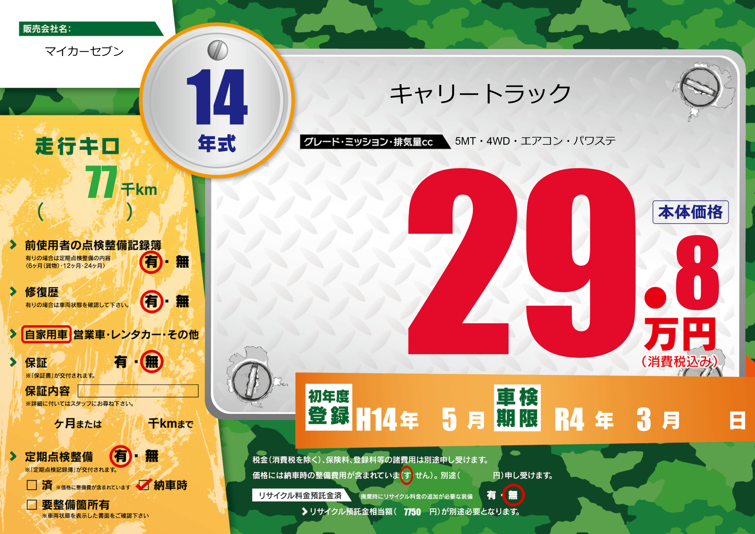 | 車検制限 | R4年 3月 - 日 | ||