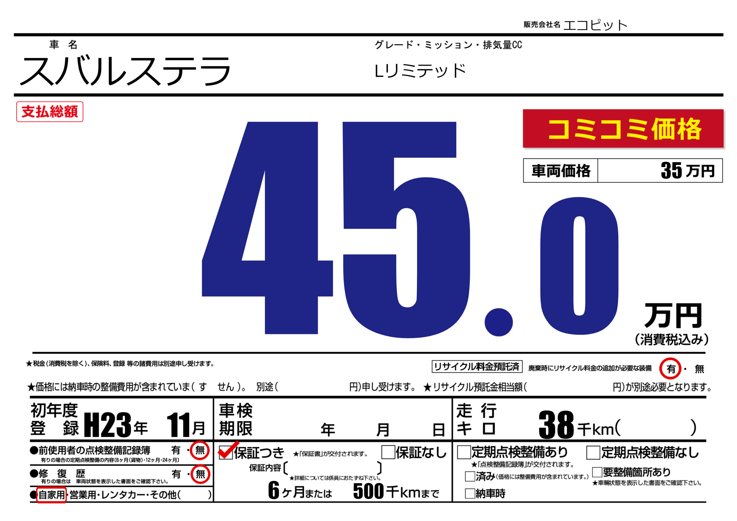 | 車名 | スバルステラ | グレード ミッション 排気量 |
