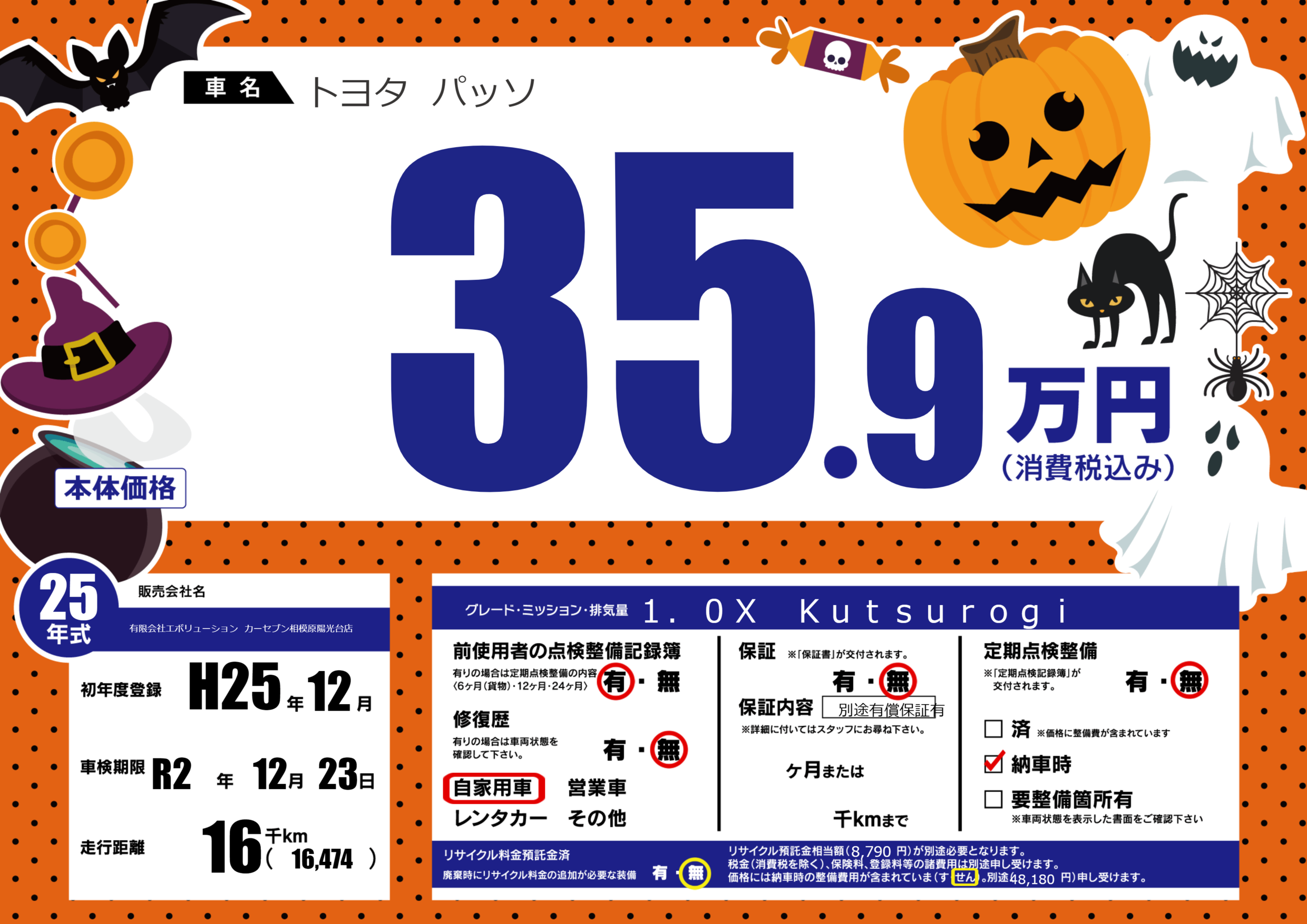 | 車名 | トヨタ パッソ | グレード ミッション 排気量 |