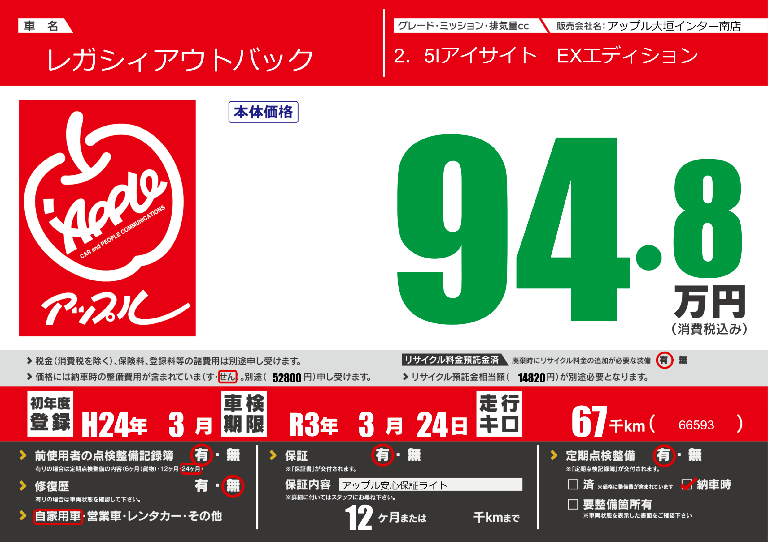 保証付き 保証内容(アップル安心保証ライト) 12ヶ月または()千kmまで |