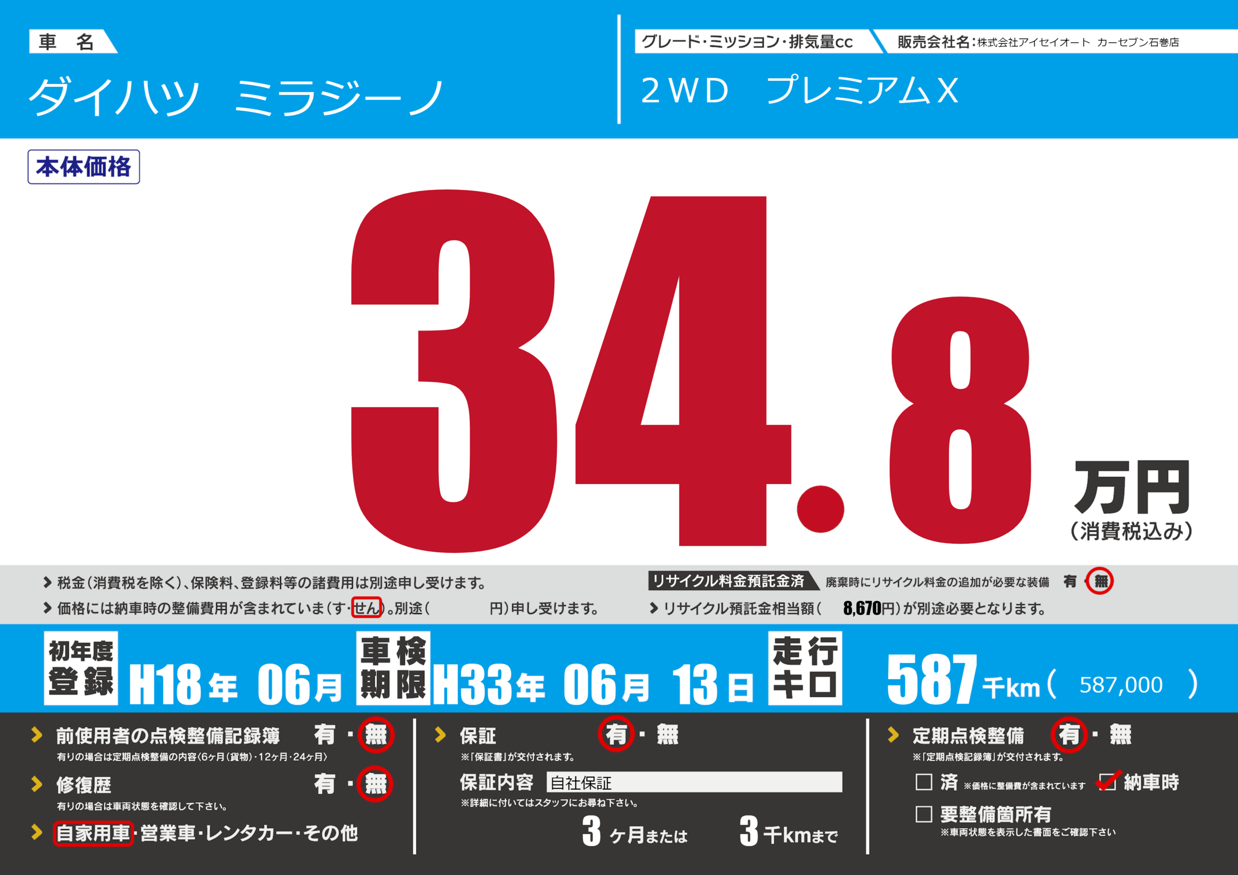 | 車名 | ダイハツ ミラジーノ | グレード ミッション 排気量 |