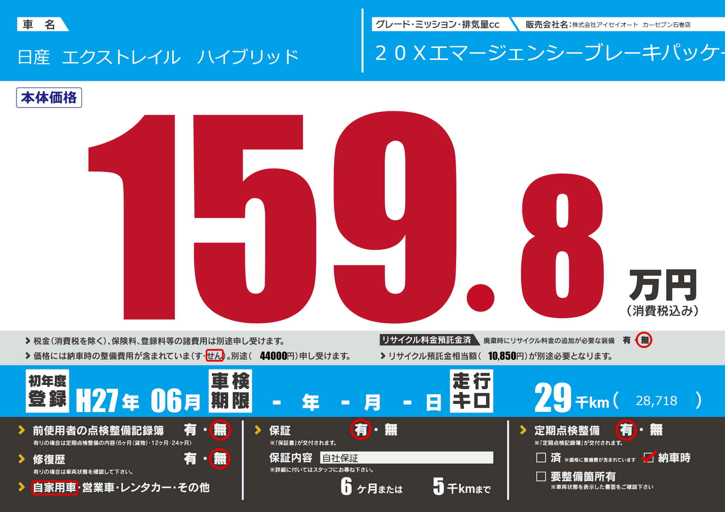 | 車名 | 日産 エクストレイル ハイブリッド | グレード ミッション 排気量 |