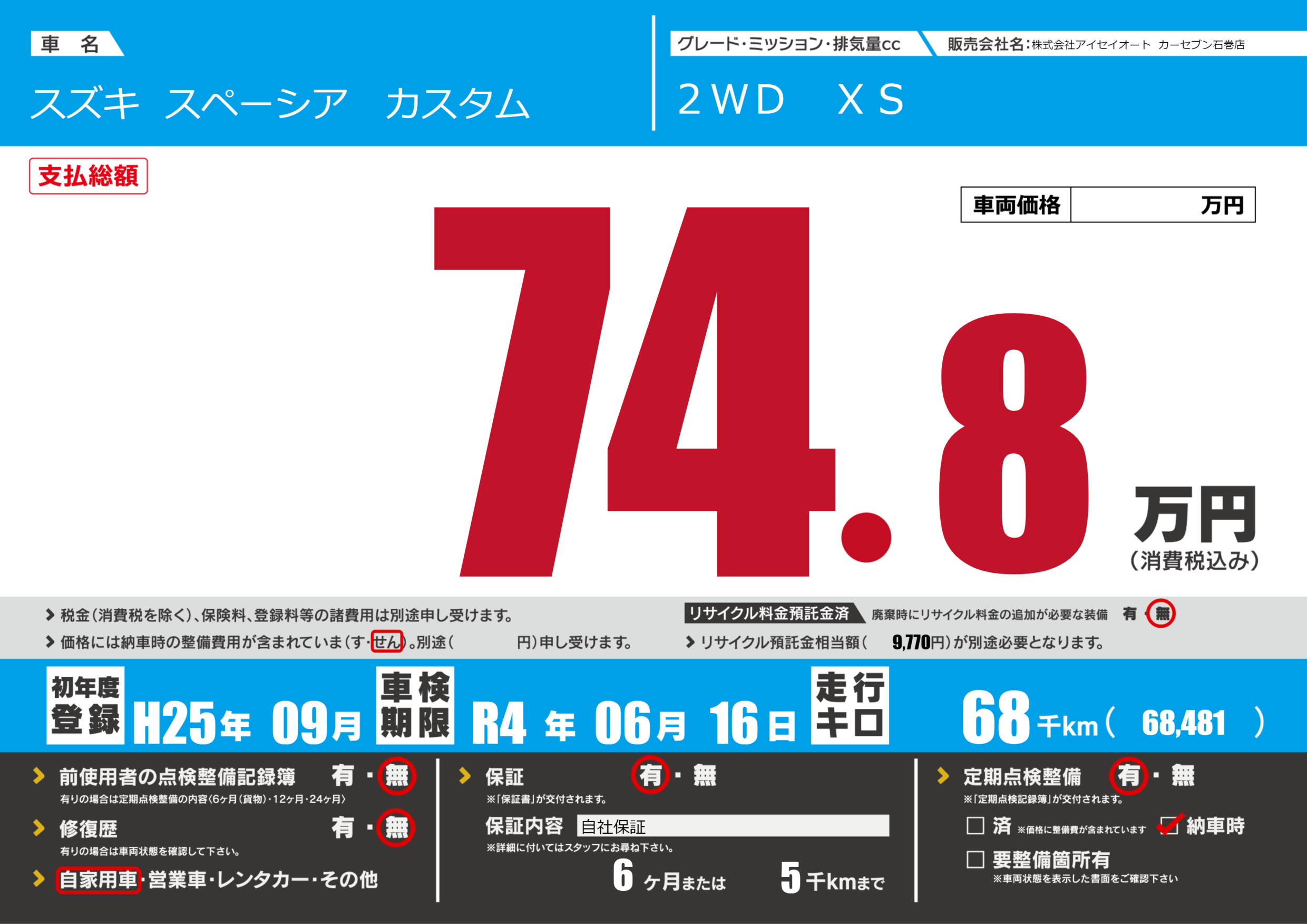 | 定期点検整備 | 定期点検整備あり 納車時あり | ||