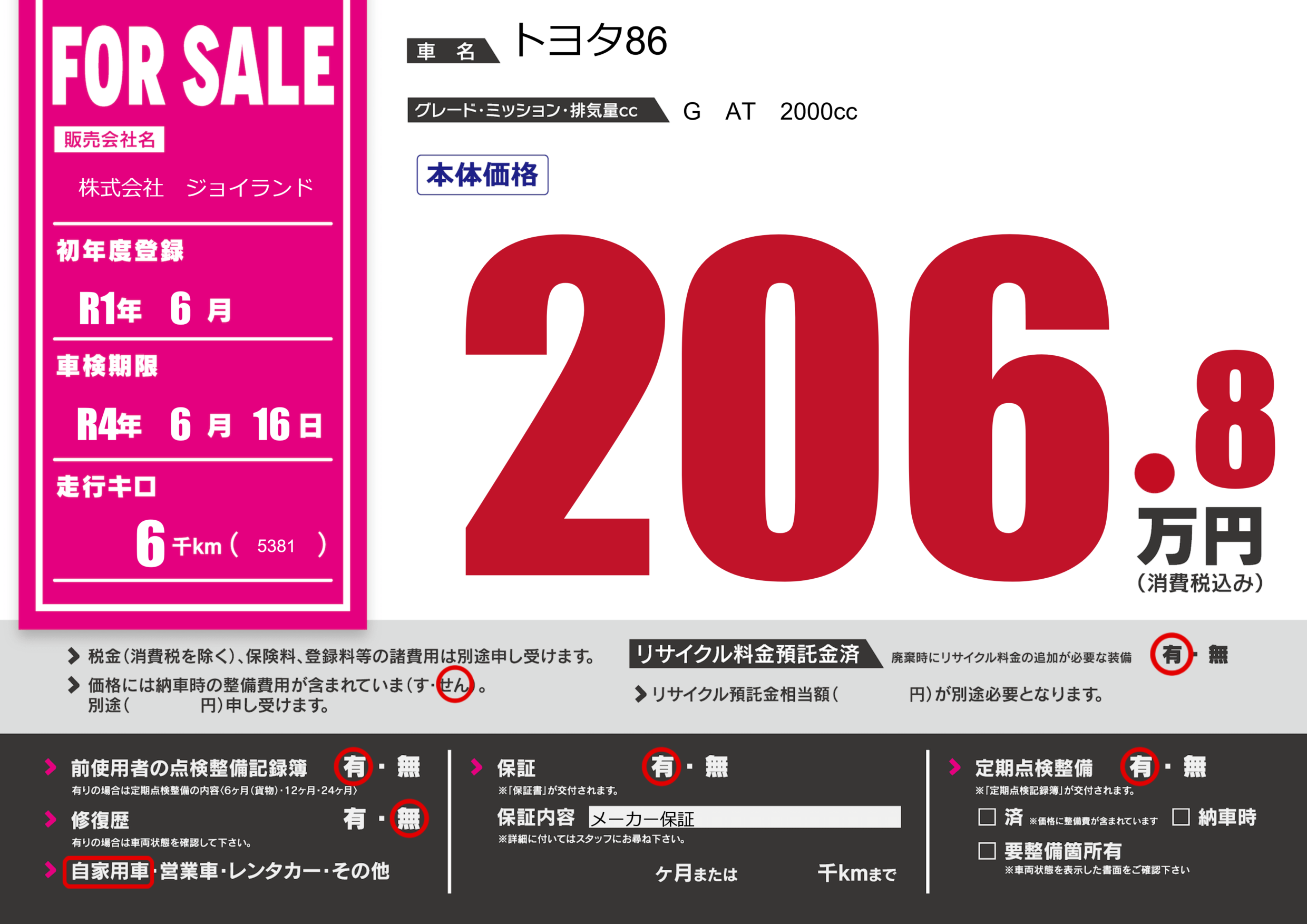 | 車名 | トヨタ86 | グレード ミッション 排気量 |