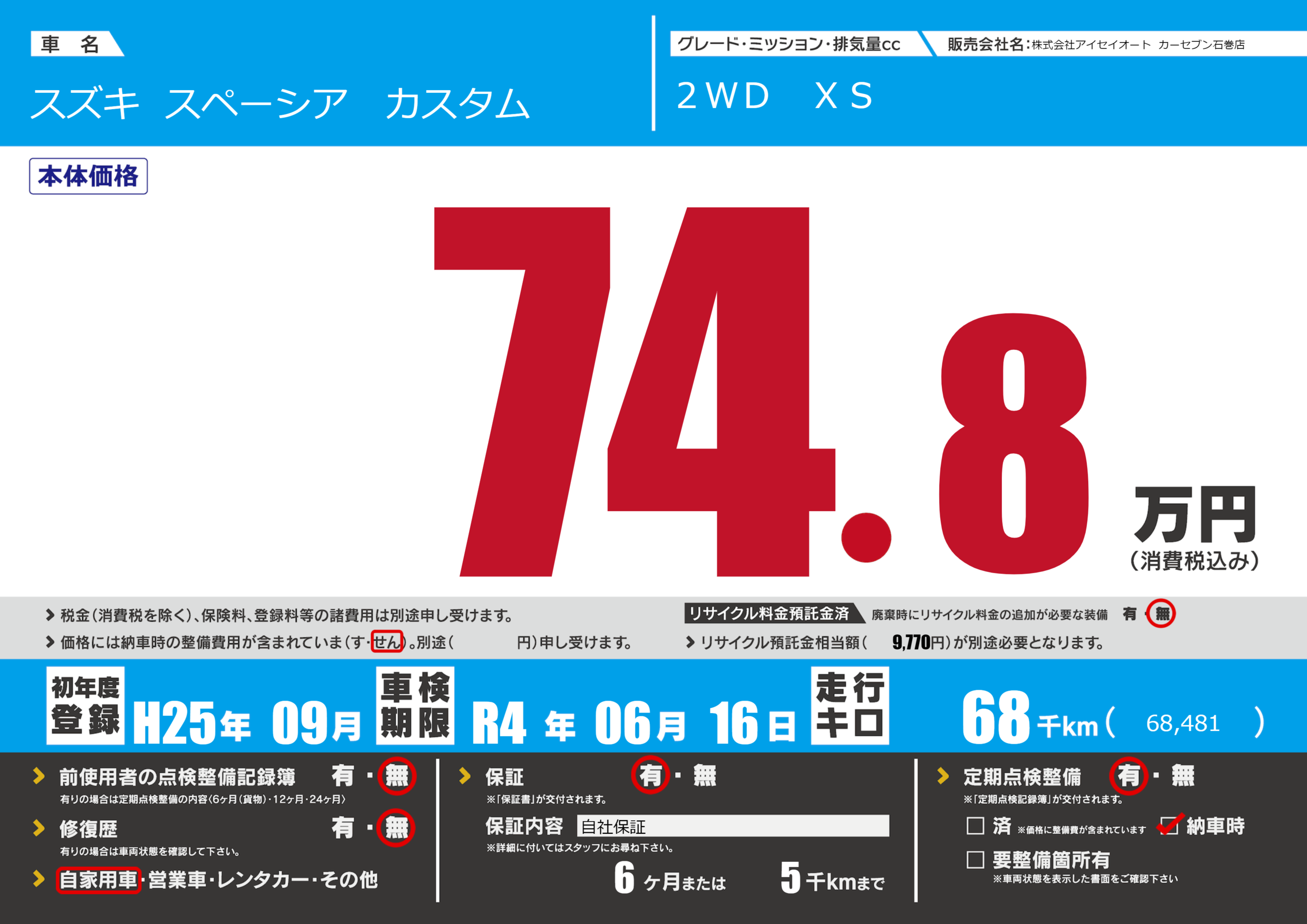 | 車名 | スズキ スペーシア カスタム | グレード ミッション 排気量 |