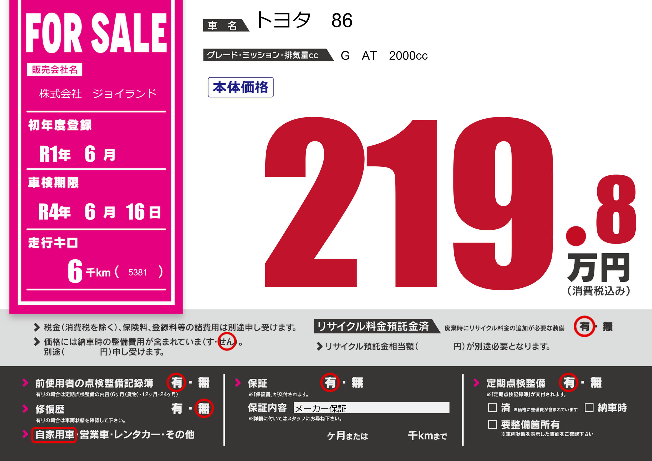 | 車名 | トヨタ 86 | グレード ミッション 排気量 |
